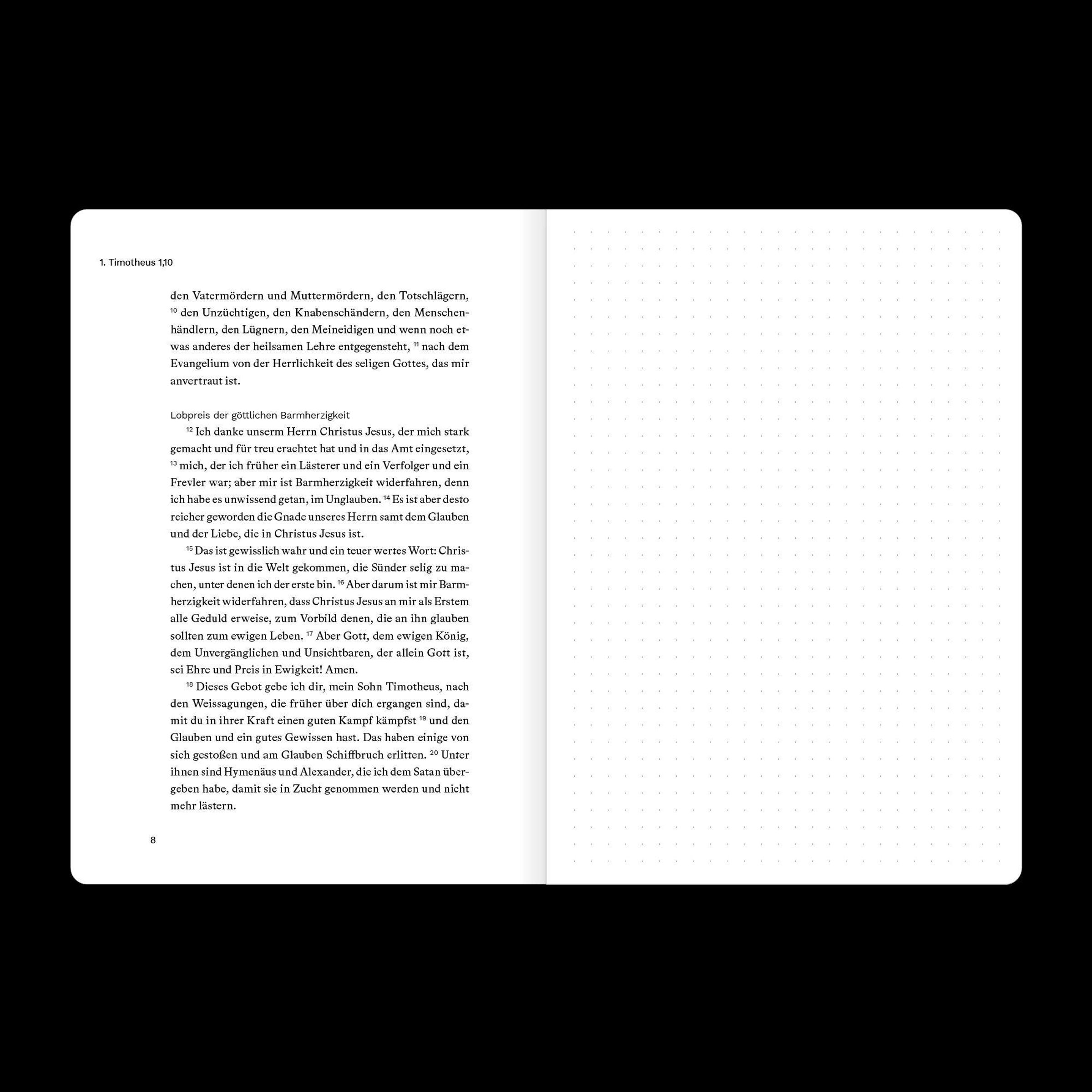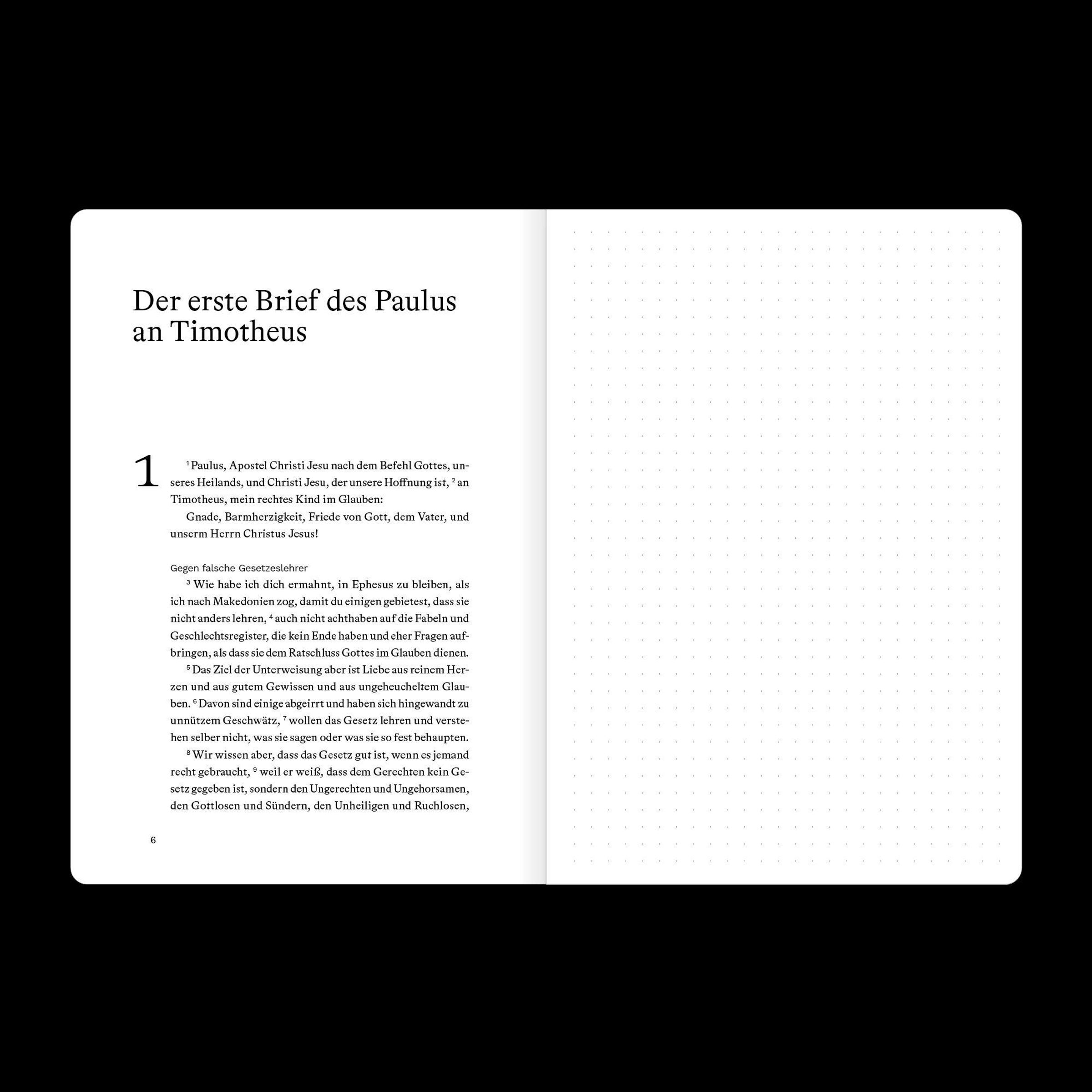 Diefses Bibeljournal kombiniert den vollständigen Bibeltext eines biblischen Buches (Luther 2017) und eine gegenüberliegende Seite mit dezentem Punktraster für deine persönlichen Notizen, Gedanken oder Gebete. So kannst du direkt neben dem Text festhalten, was dich beim Lesen bewegt.