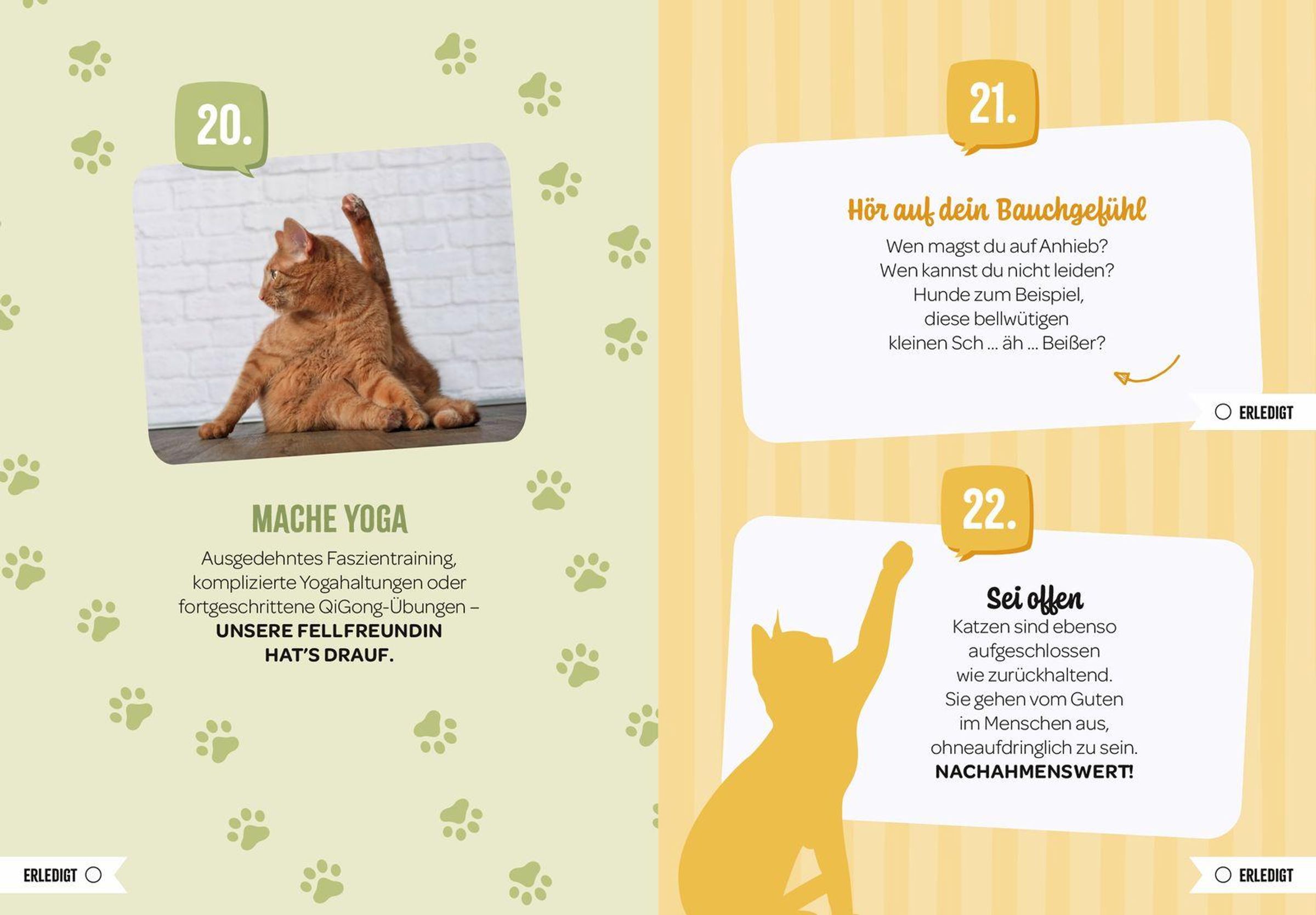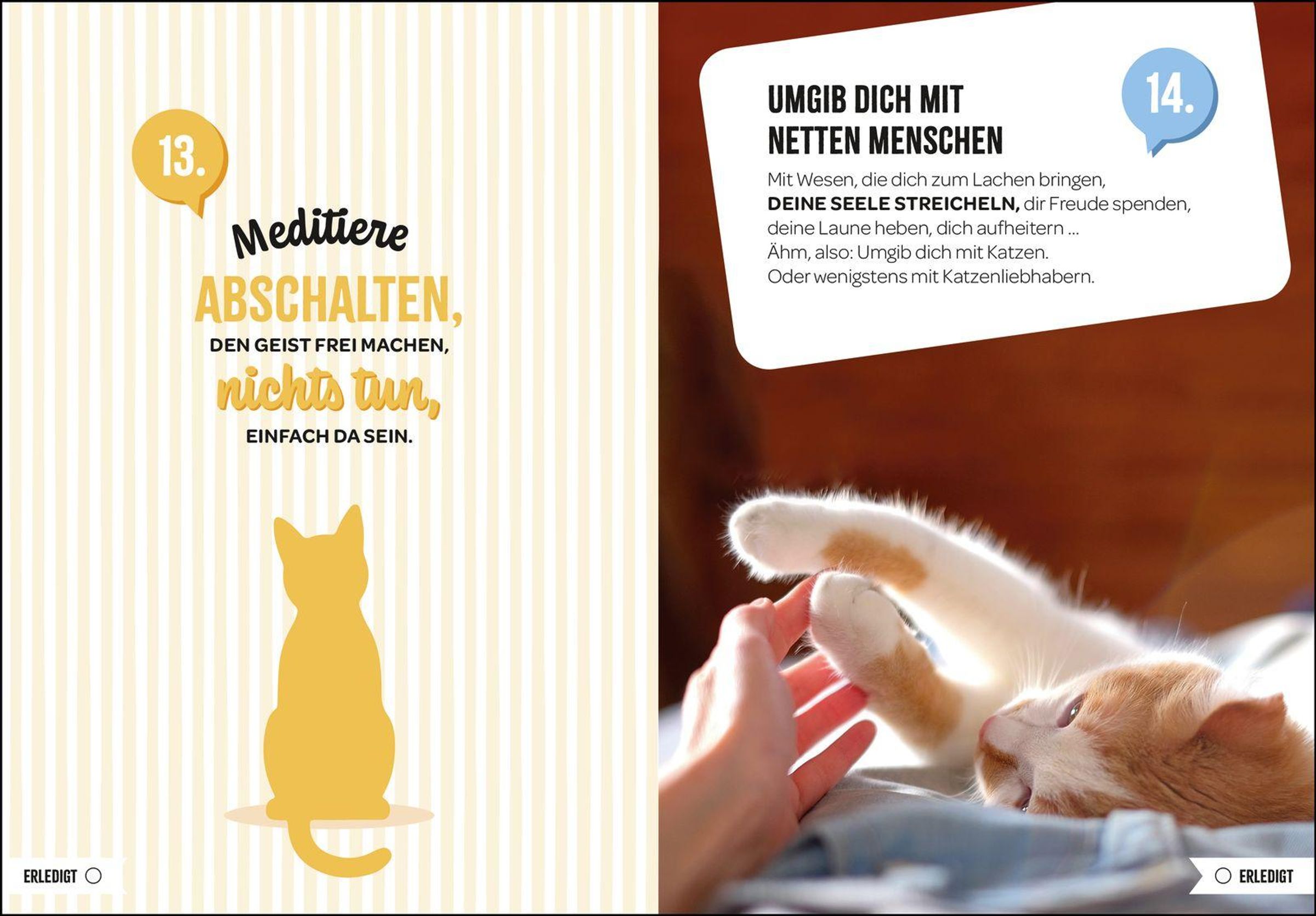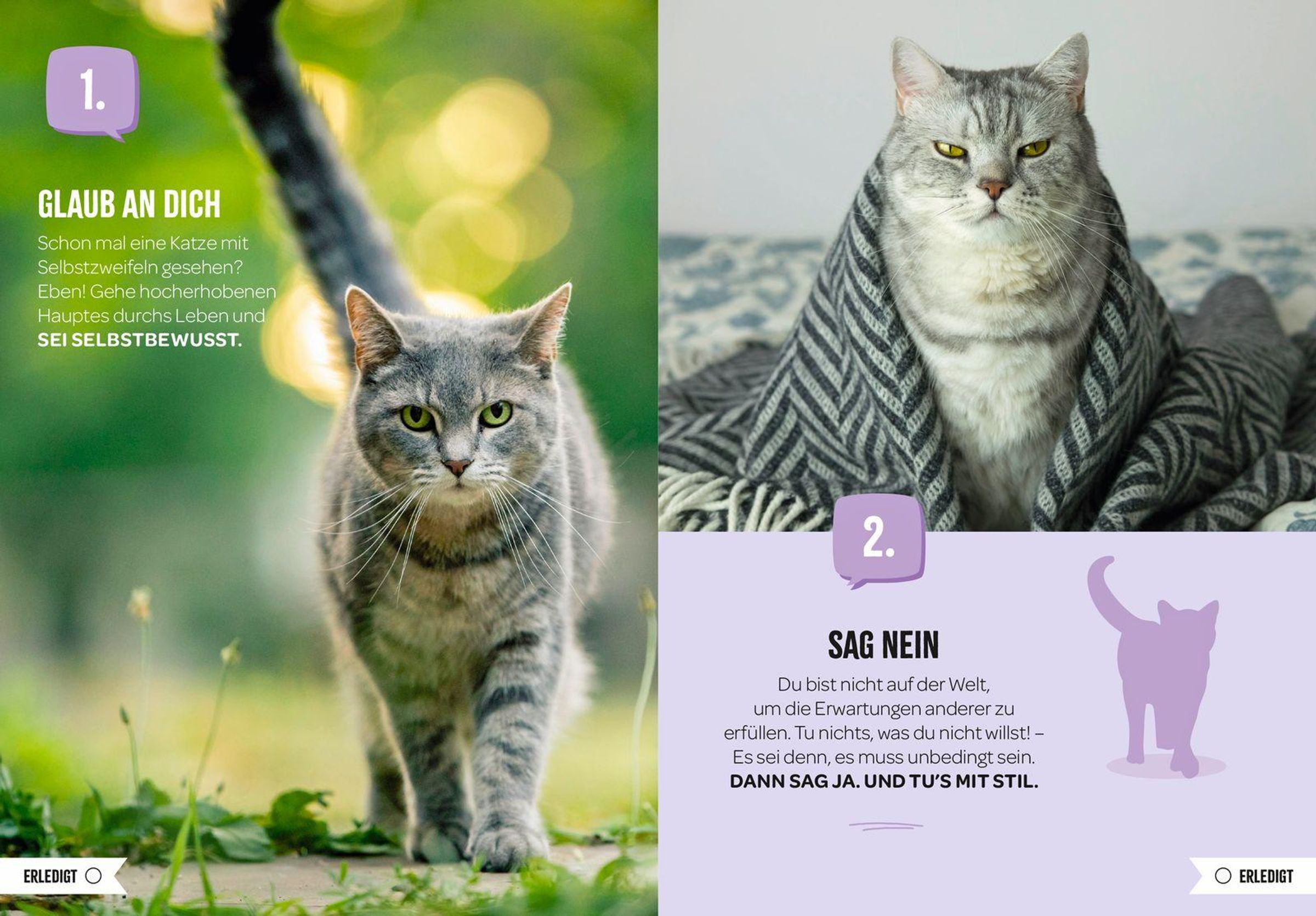 - Zahlreiche Katzen-Fotos, Illustrationen und kurze, humorvolle Texte rund um die Katze und ihre Eigenschaften