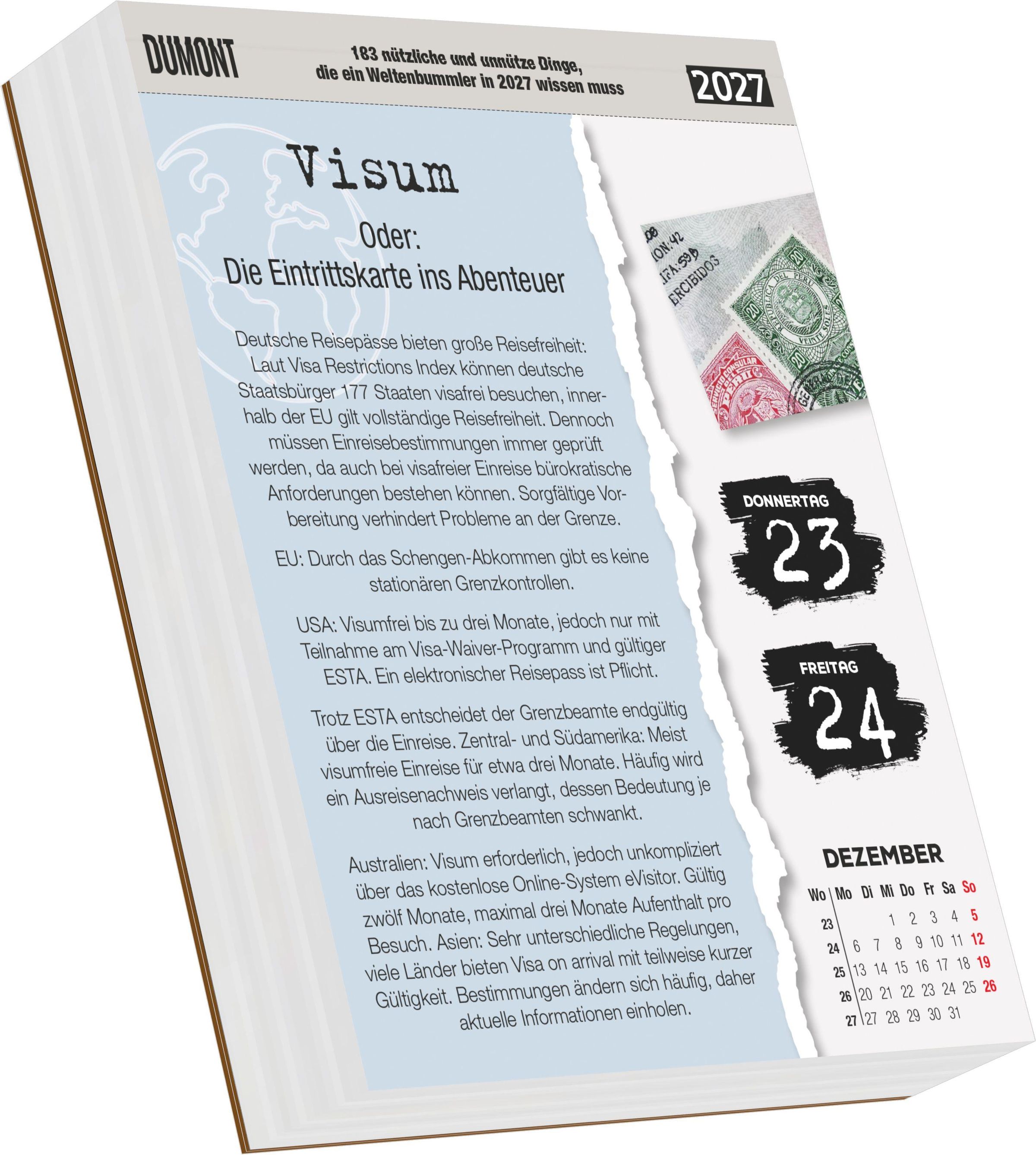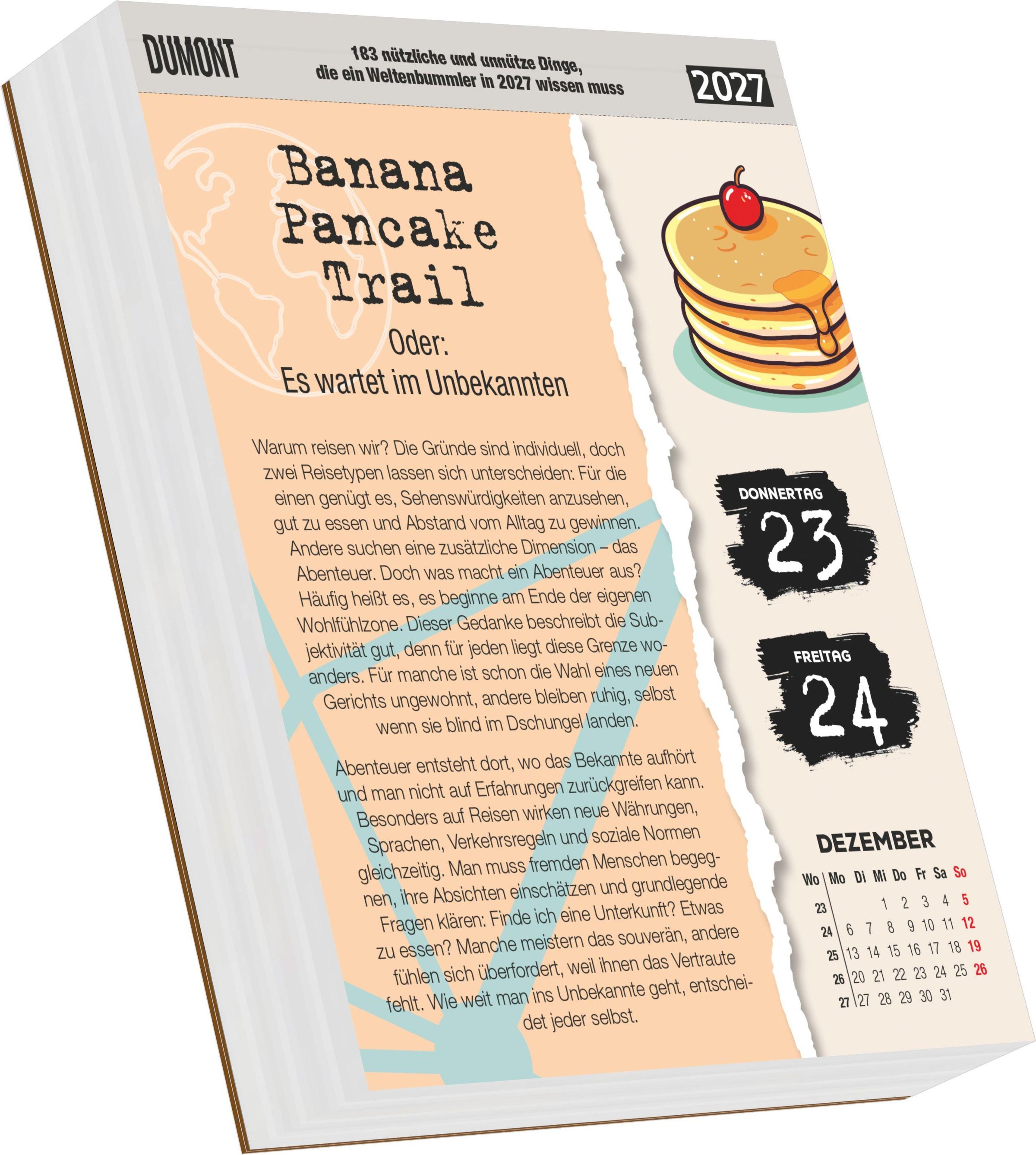 Der DUMONT Abreißkalender 2027 ist mehr als ein Kalender: Er ist eine humorvolle Mini-Weltreise in Tagesportionen -- mit Wissen, das manchmal nützlich, manchmal herrlich unnütz ist, aber immer Lust aufs nächste Abenteuer macht.