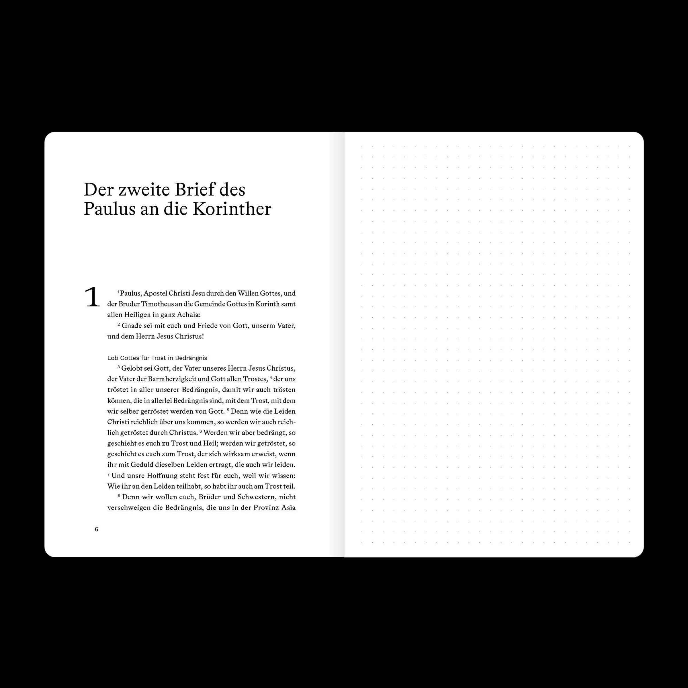 Dieses Bibeljournal kombiniert den vollständigen Bibeltext eines biblischen Buches (Luther 2017) und eine gegenüberliegende Seite mit dezentem Punktraster für deine persönlichen Notizen, Gedanken oder Gebete. So kannst du direkt neben dem Text festhalten, was dich beim Lesen bewegt.
