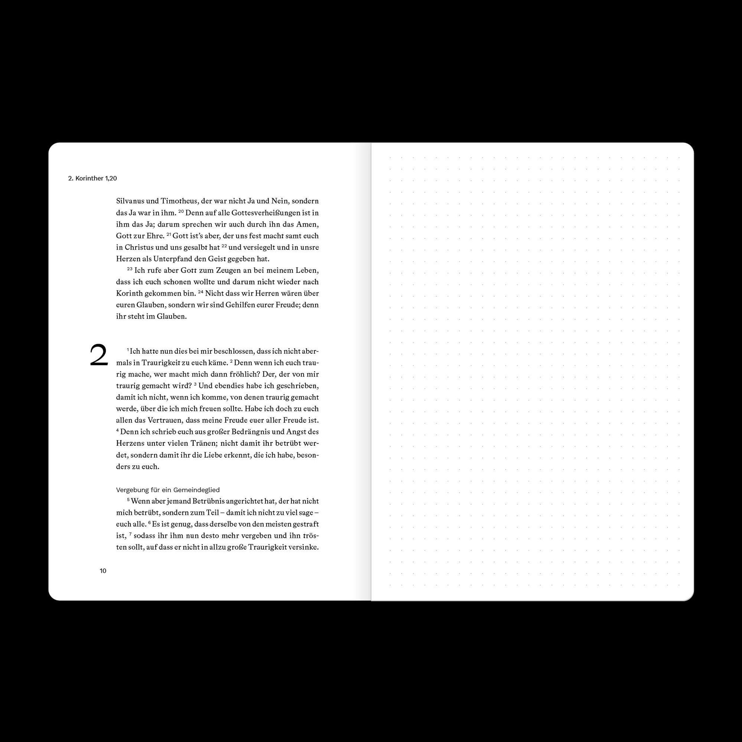 Mit seinem flach aufschlagbaren Einband, dem angenehmen Papier und viel Platz zum Schreiben lädt es dazu ein, in der Bibel zu lesen, darüber nachzudenken und Gottes Wort ganz persönlich zu entdecken.