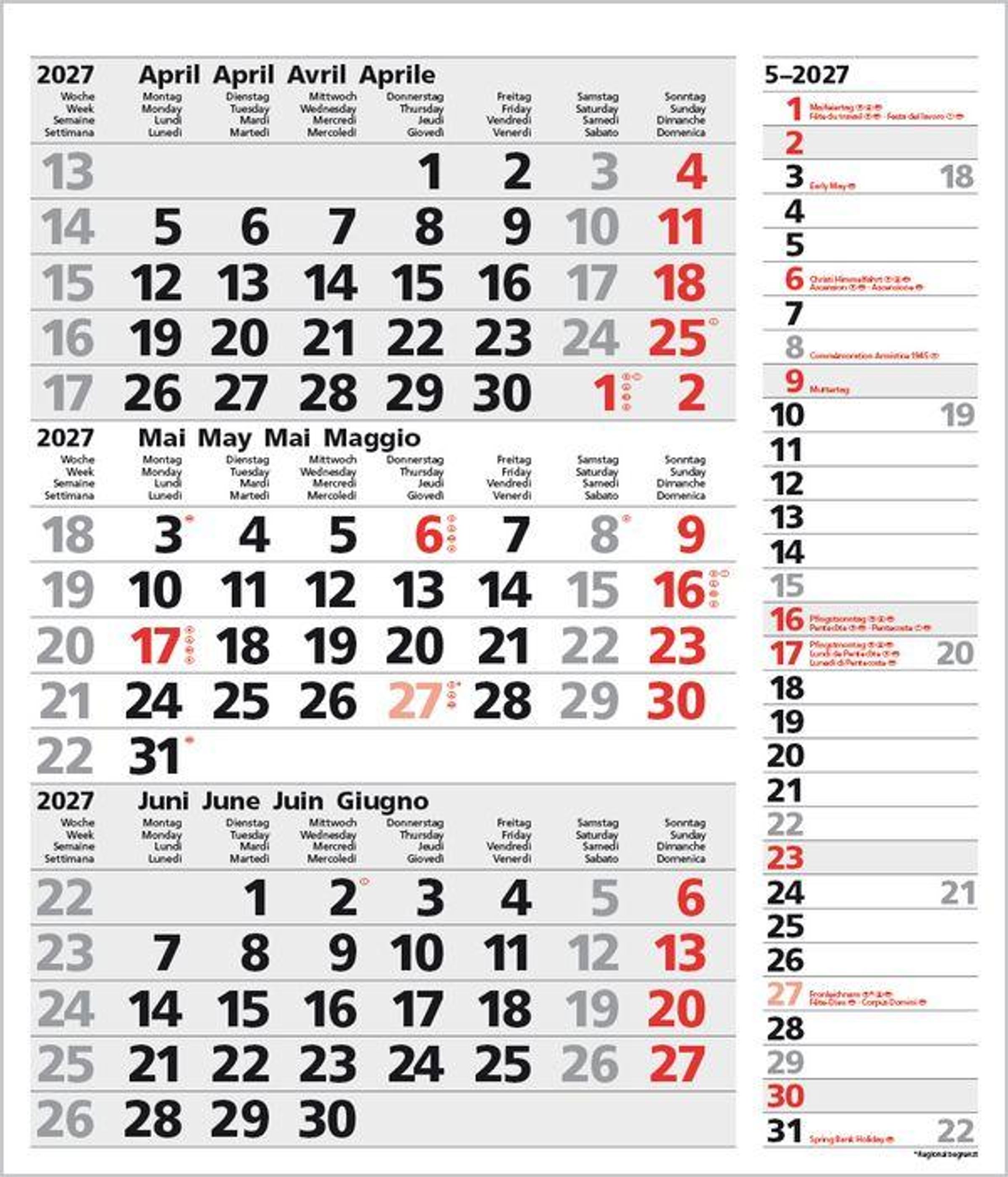 - Kalendarium auf D/E/F/I mit farblich hervorgehobenen Feiertagen für Deutschland, Österreich und Schweiz.