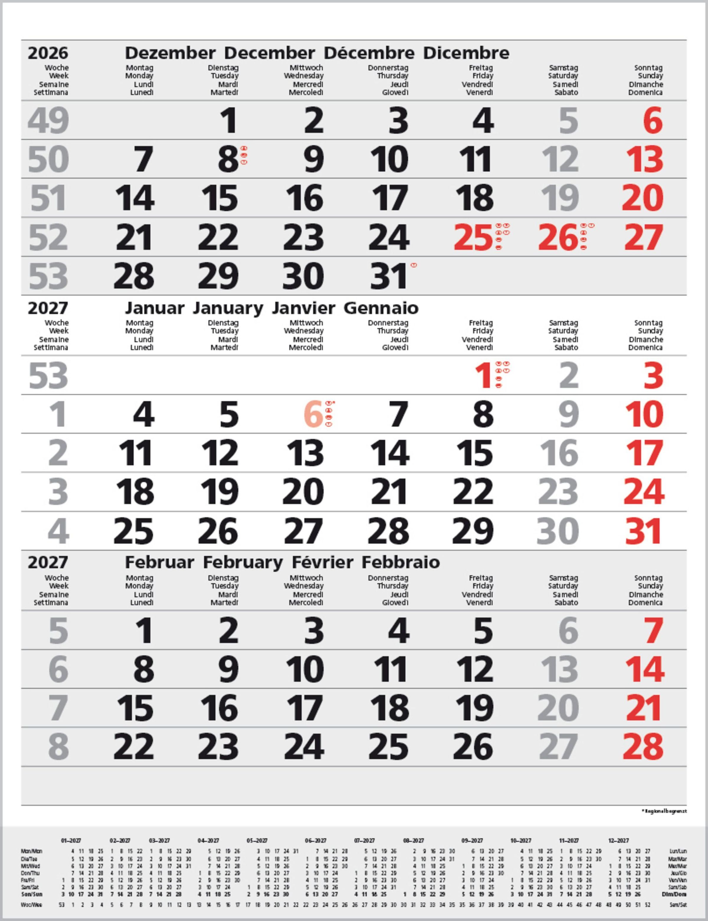 Kalender für 2026/2027 mit Monaten Dezember, Januar, Februar. Wochentage in mehreren Sprachen, Wochenzahlen links., Kalender