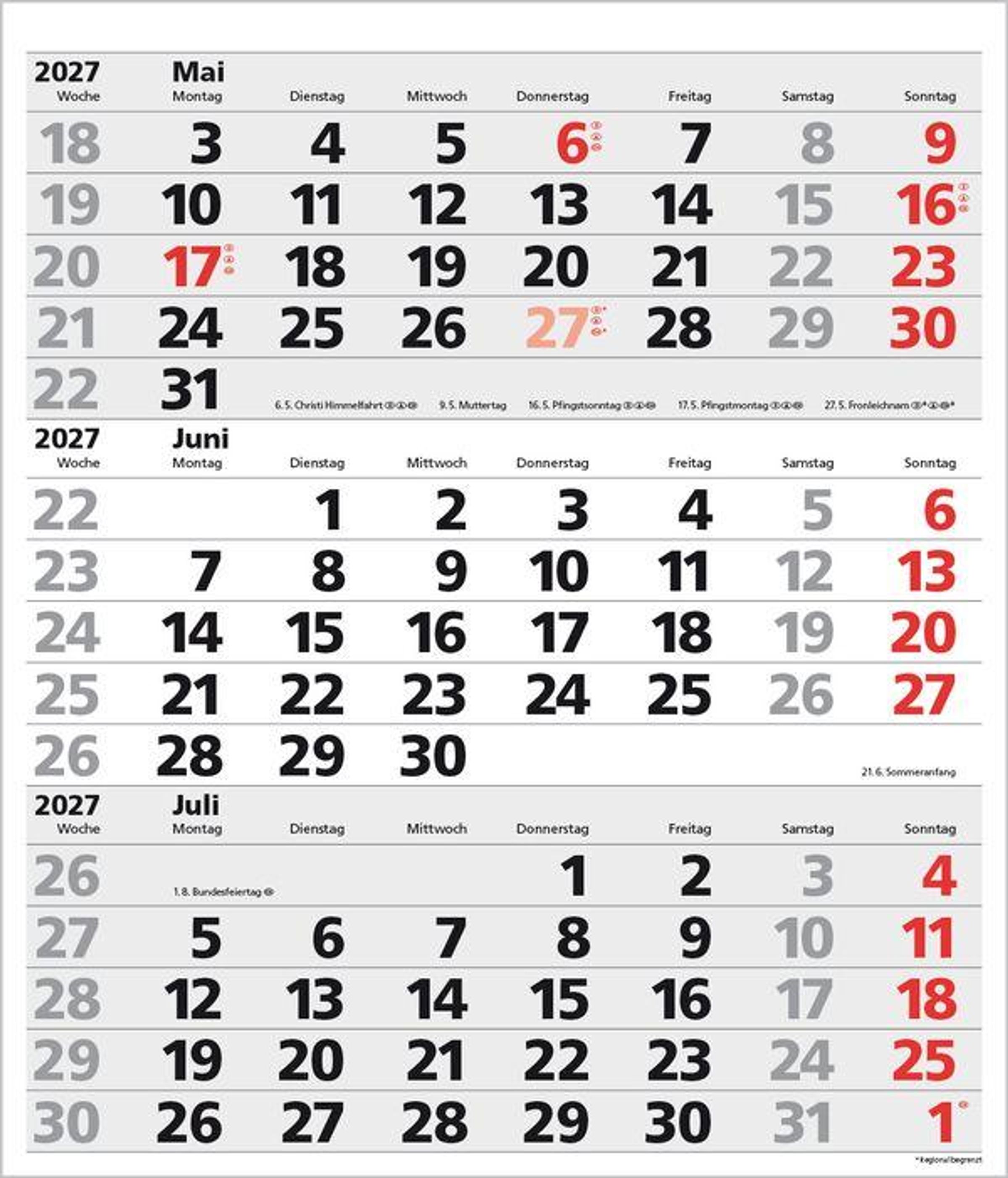 - Kalendarium auf D/E/F/I mit farblich hervorgehobenen Feiertagen für Deutschland, Österreich und Schweiz.