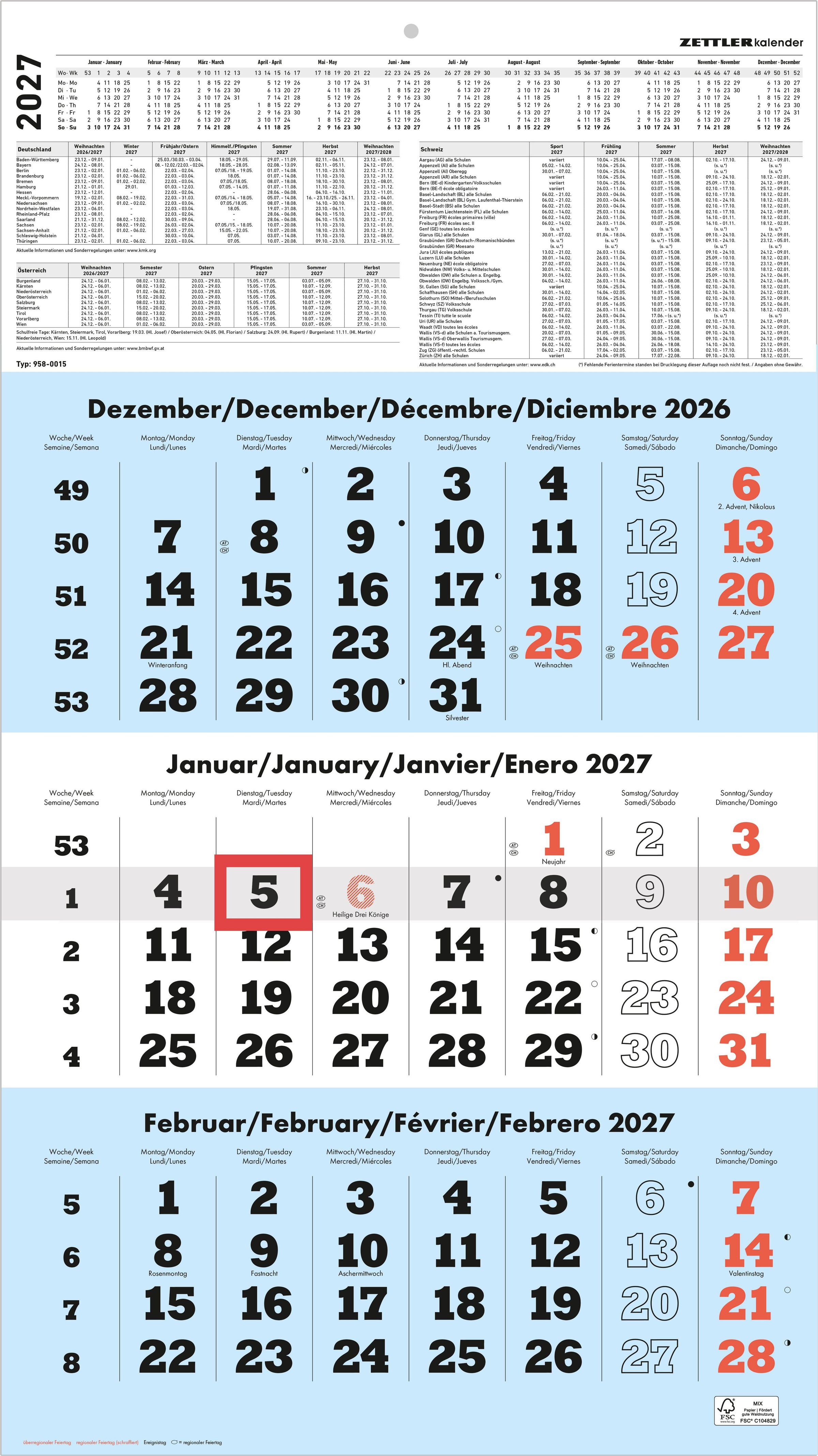 Kalender für Dezember 2026 bis Februar 2027. Feiertage wie Weihnachten und Silvester markiert. Wochentage mehrsprachig aufgelistet., Kalender