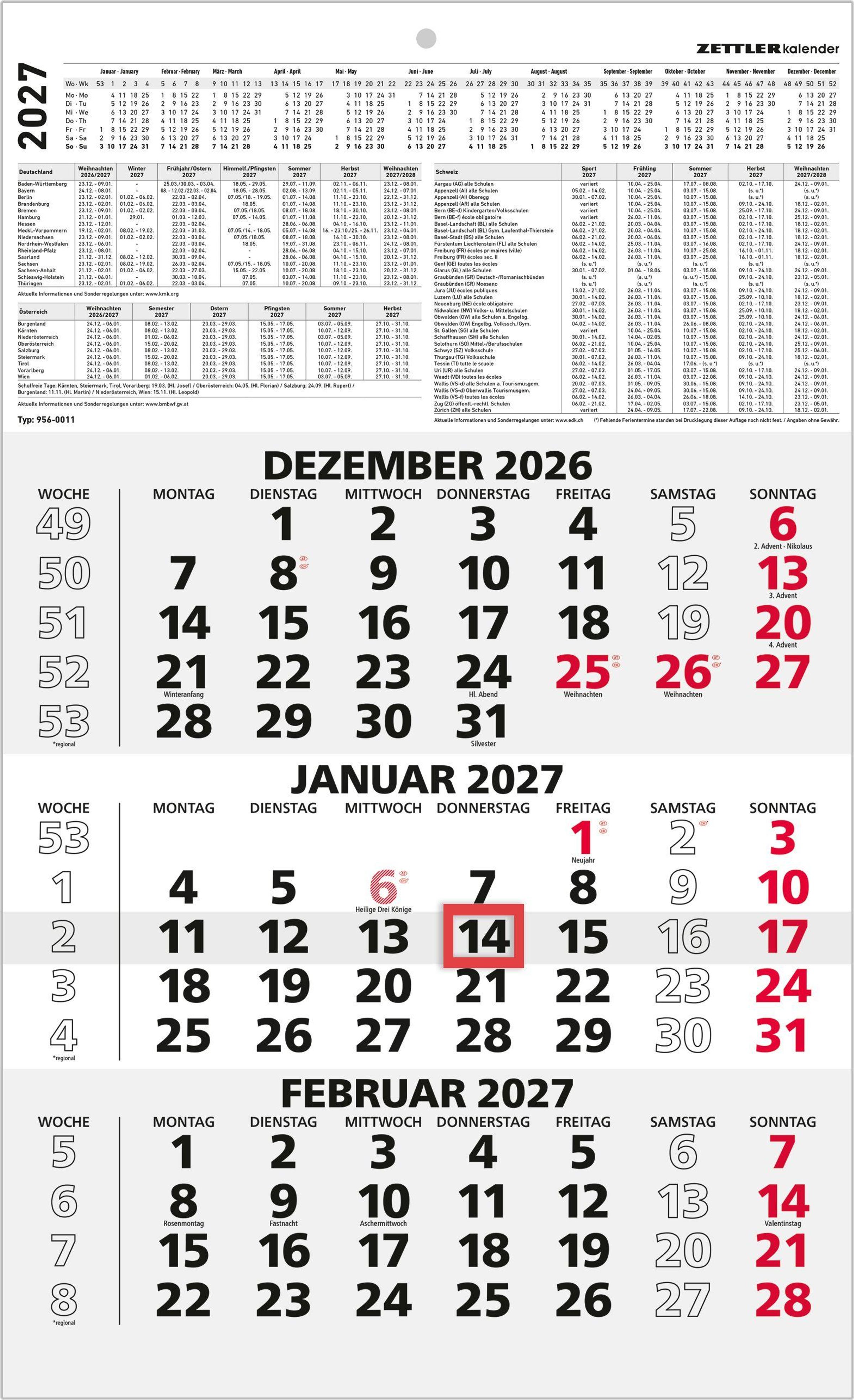 Der Zettler 3-Monatskalender schwarz / rot 2027 bietet drei Monate auf einen Blick und überzeugt durch eine klare Struktur. Mit Datumschieber, praktischer Jahresübersicht sowie zusätzlichem Platz für Mondphasen und Ferientermine eignet er sich ideal für Büro und Homeoffice.