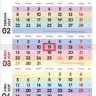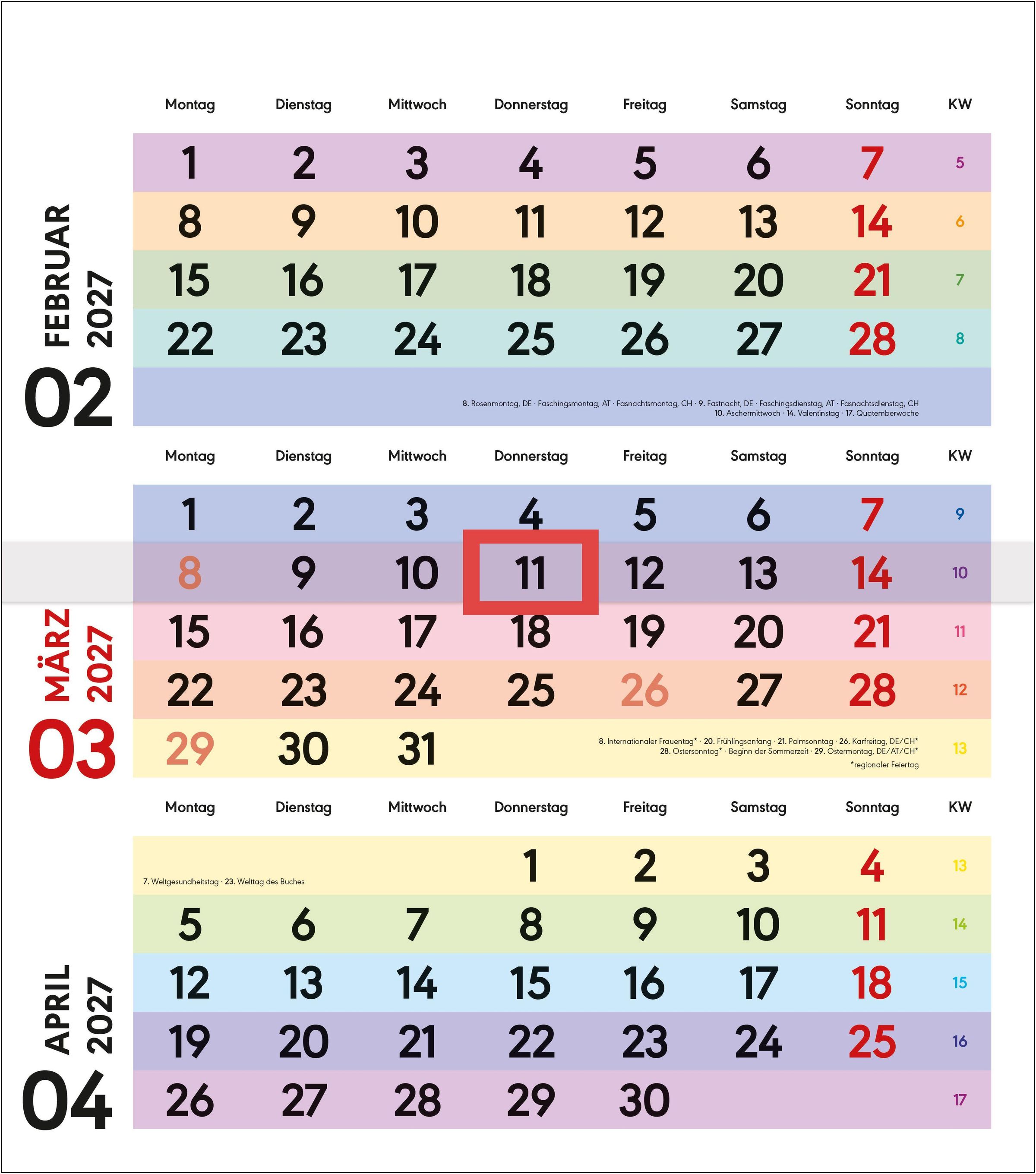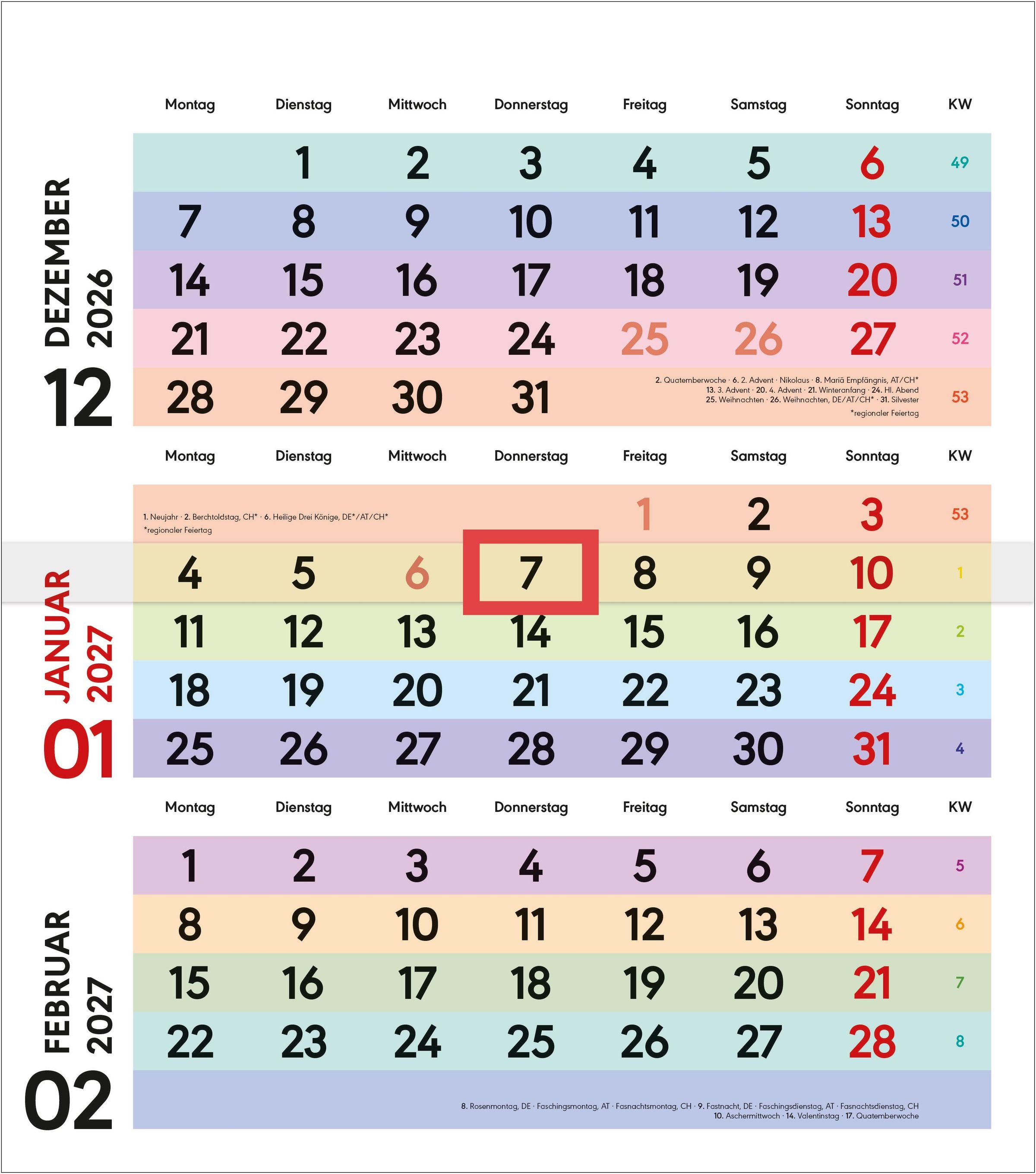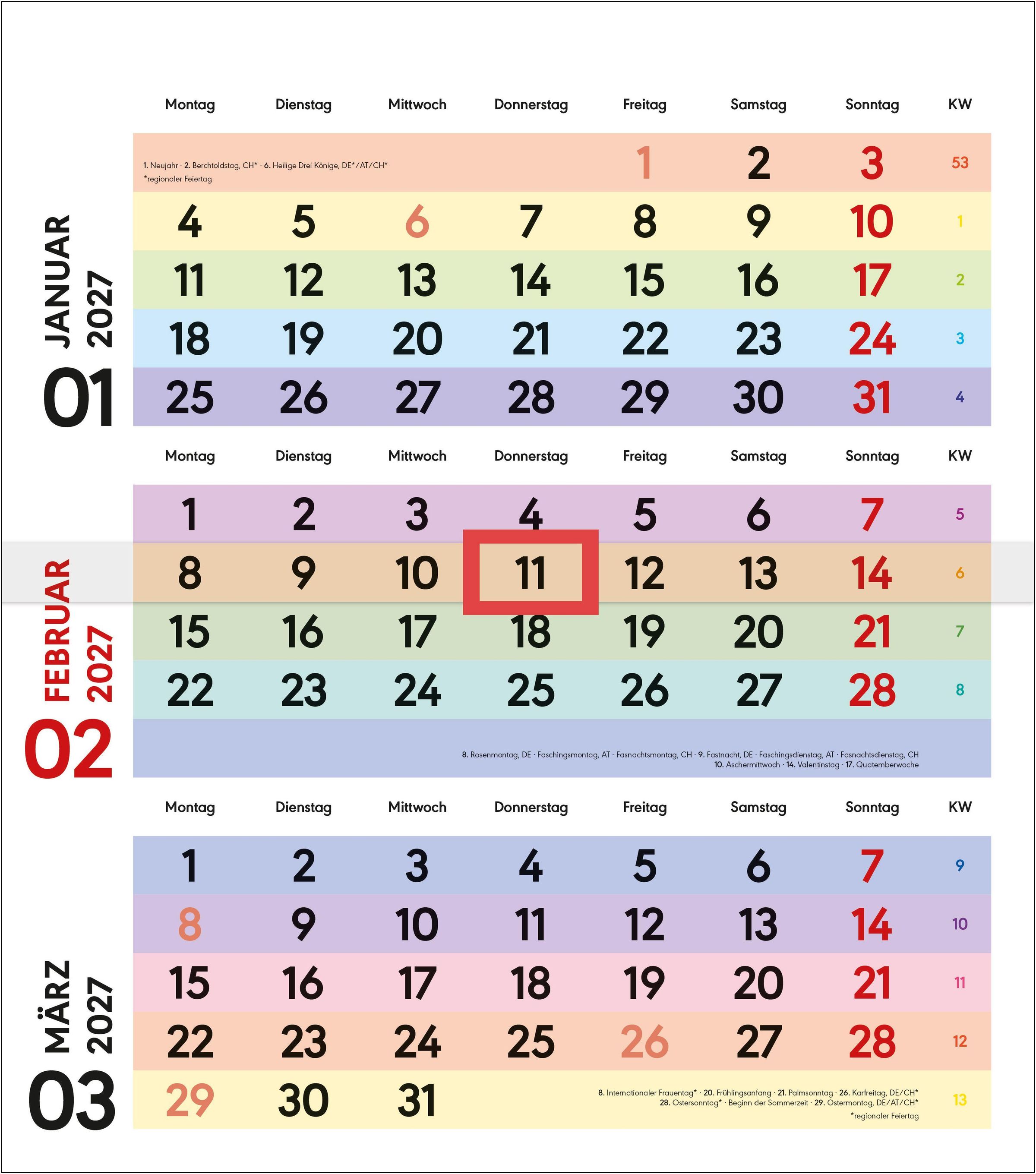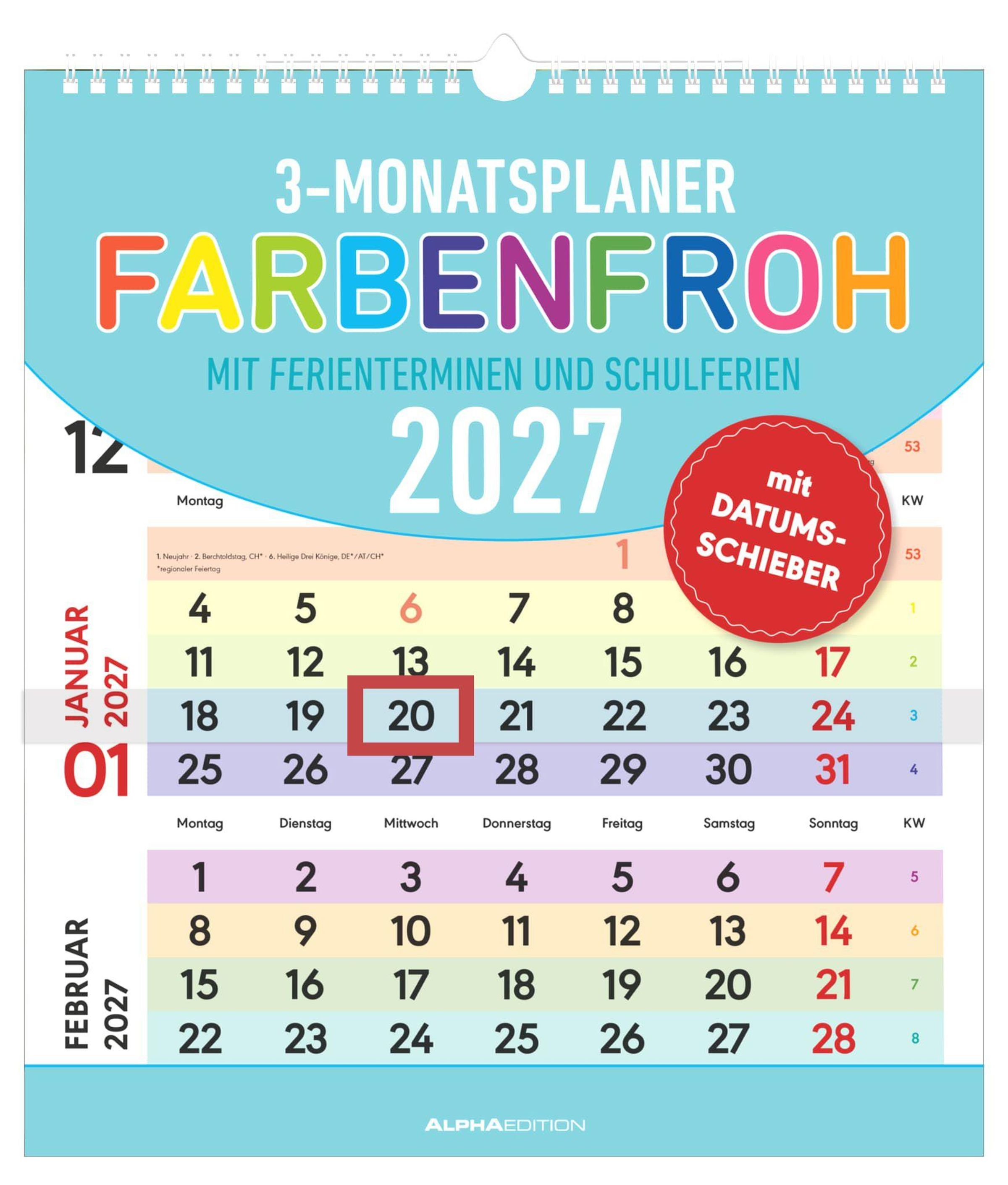 3-Monatsplaner "FARBENFROH" 2027 mit Ferienterminen. Roter Stempel: "mit DATUM-SCHIEBER". Kalender mit bunten Feldern., Kalender
