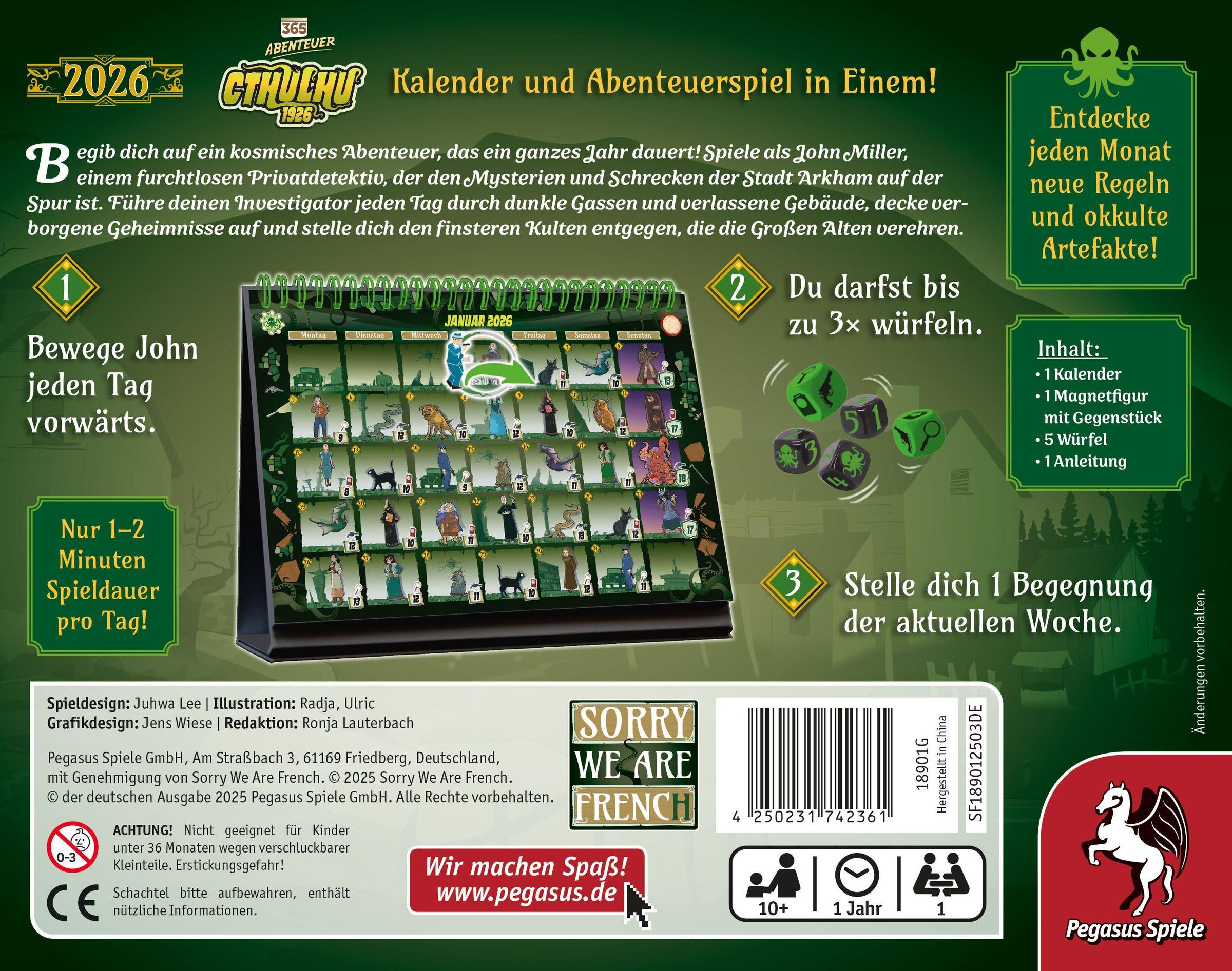 Gerüchte über mysteriöse Kreaturen und dunkle Kulte häufen sich in der rätselhaften Stadt Arkham. Doch der Privatdetektiv John Miller ist bereit, mit Pistole und Taschenlampe in die Dunkelheit einzutauchen und den Geheimnissen auf die Spur kommen ... Mit 365 Adventures - Cthulhu 1926 schlüpfen die Spielenden für ein ganzes Jahr lang in die Rolle des Privatdetektivs John Miller und begeben sich auf ein kosmisches Abenteuer, das sie in dunkle Gassen und verlassene Gebäude der mysteriösen Stadt Arkham führt. Jeden Tag handeln sie eine neue Begegnung ab und entdecken neue verborgene Geheimnisse um finstere Kulte, die die Großen Alten verehren. Für jede erfolgreich besiegte Sonderbegegnung am Sonntag gibt es Punkte, aber jeden Tag steigt auch die Wahrscheinlichkeit, wahnsinnig zu werden ... Zu Beginn jedes neuen Monats erfahren die Spielenden, wie Johns Geschichte weitergeht. Außerdem kommen nun auch neue Regeln oder magische Artefakte ins Spiel. Für ihr tägliches Abenteuer brauchen die Spielenden maximal 5 Minuten und das Spielprinzip von 365 Adventures - Cthulhu 1926ist schnell erklärt: Zunächst wird der magnetische Held auf dem Kalender zum aktuellen Tag bewegt, dann dürfen die Spielenden bis zu drei Mal würfeln, um eine Begegnung der aktuellen Woche abzuhandeln. Am Ende des Monats, zählen sie die erreichten Punkte zusammen und betreten das nächste Kapitel in der Stadt voller Rätsel und uralter Geheimnisse.