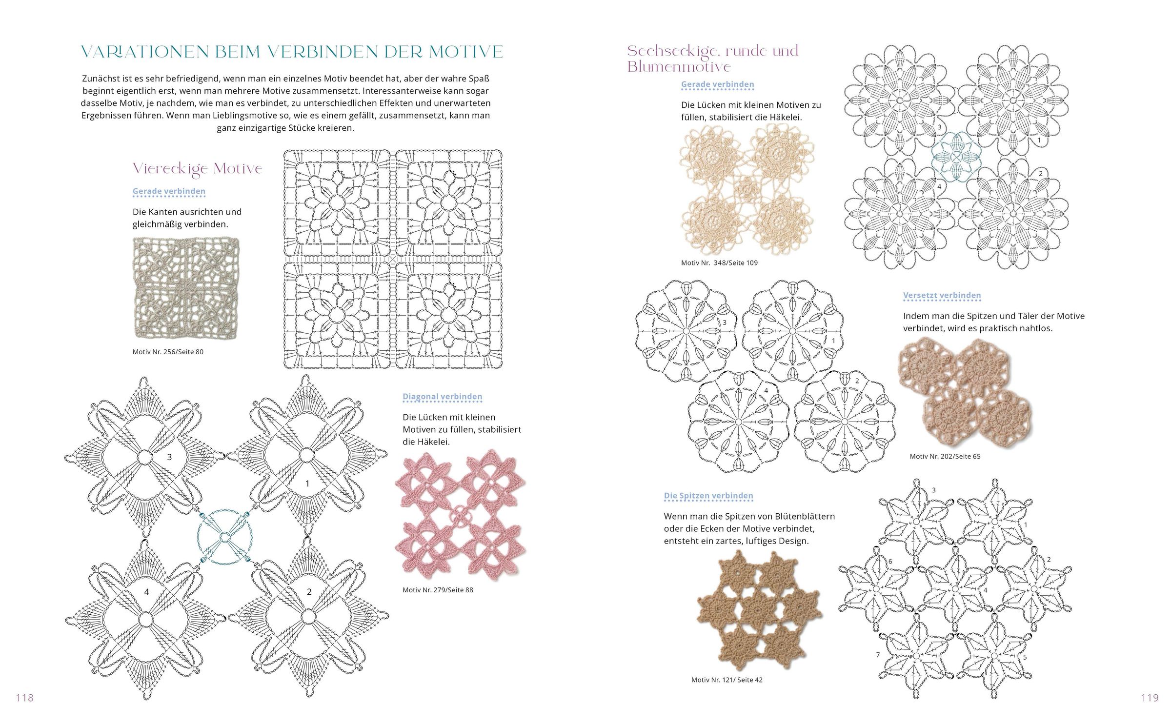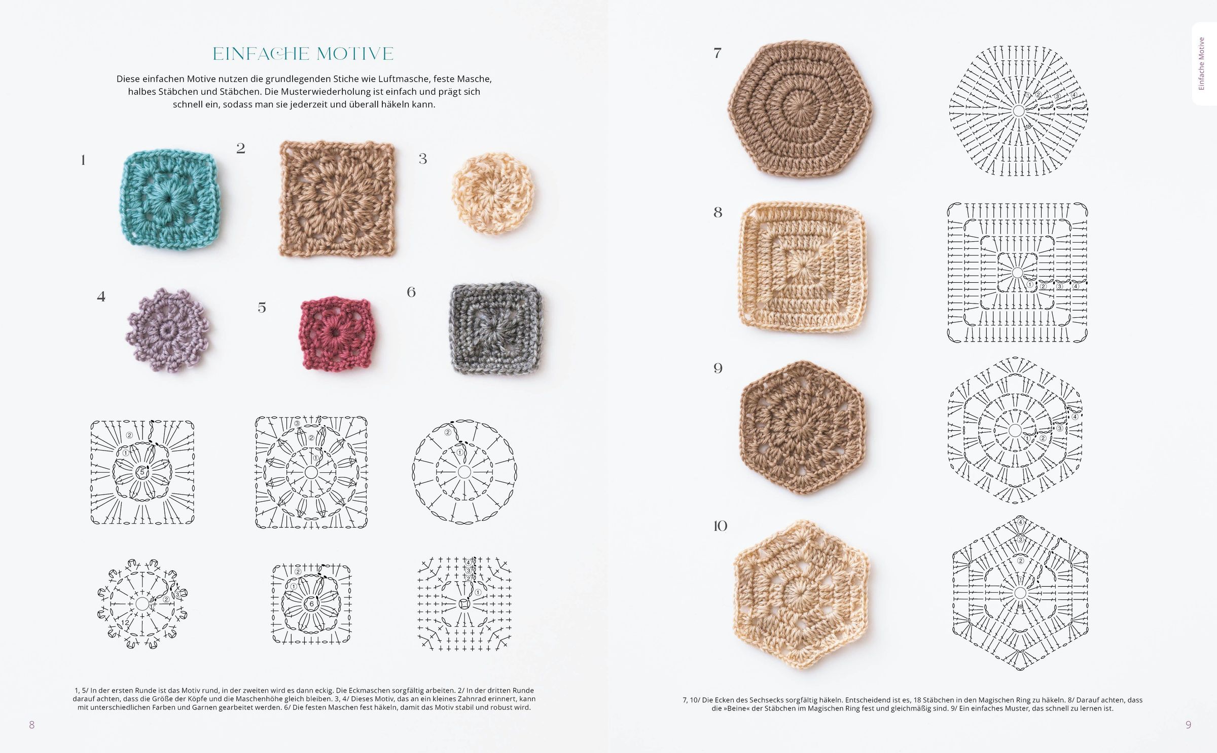 Formenvielfalt entdecken: Quadrate, Kreise, Blumen, Dreiecke, 3D-Motive und Lace-Muster erweitern das Repertoire. So entstehen Ideen für Accessoires, Kleidung und Heimtextilien - von klassischen Designs bis zu modernen Häkelmustern.