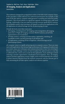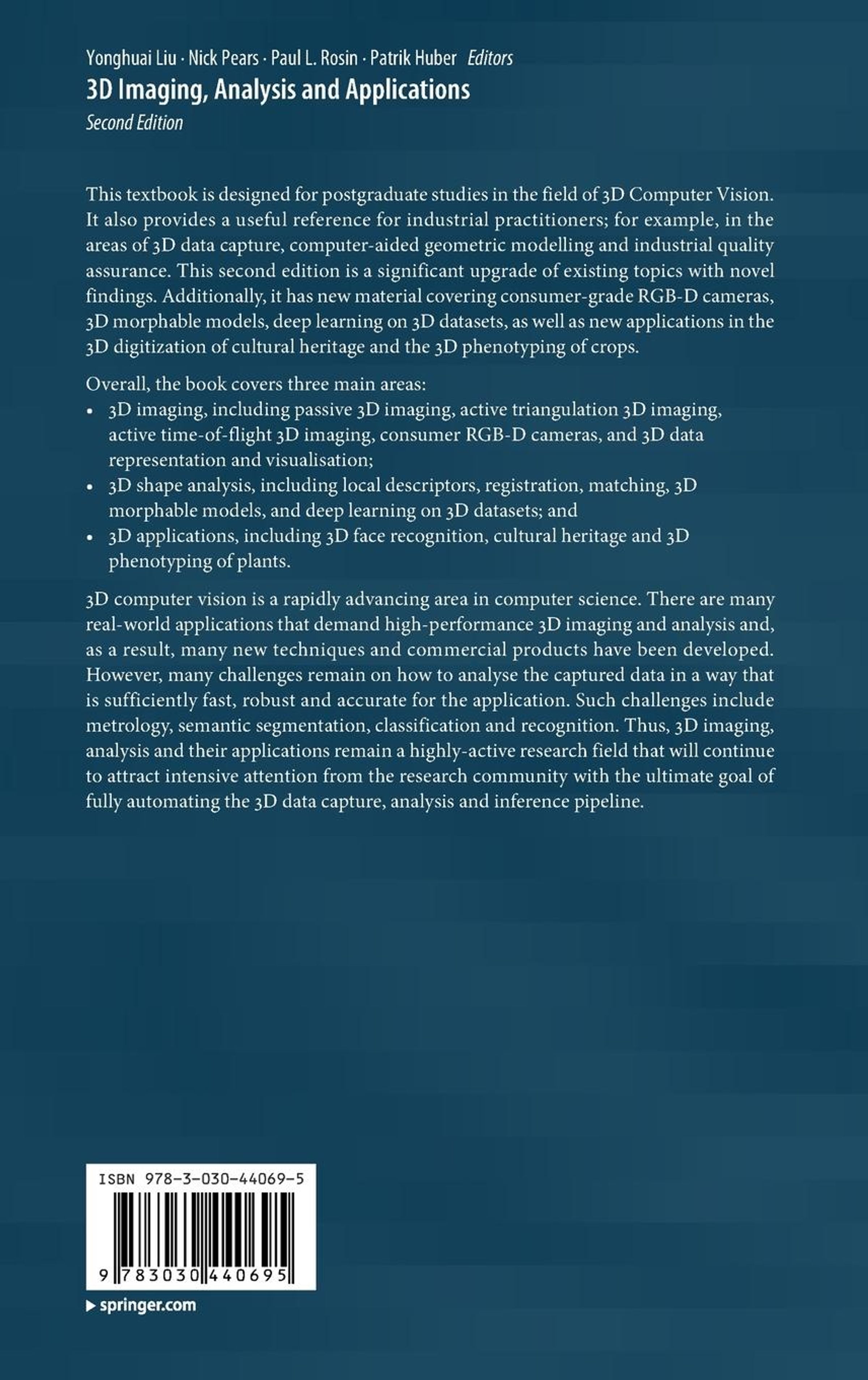 This textbook is designed for postgraduate studies in the field of 3D Computer Vision. It also provides a useful reference for industrial practitioners; for example, in the areas of 3D data capture, computer-aided geometric modelling and industrial quality assurance. This second edition is a significant upgrade of existing topics with novel findings. Additionally, it has new material covering consumer-grade RGB-D cameras, 3D morphable models, deep learning on 3D datasets, as well as new applications in the 3D digitization of cultural heritage and the 3D phenotyping of crops.