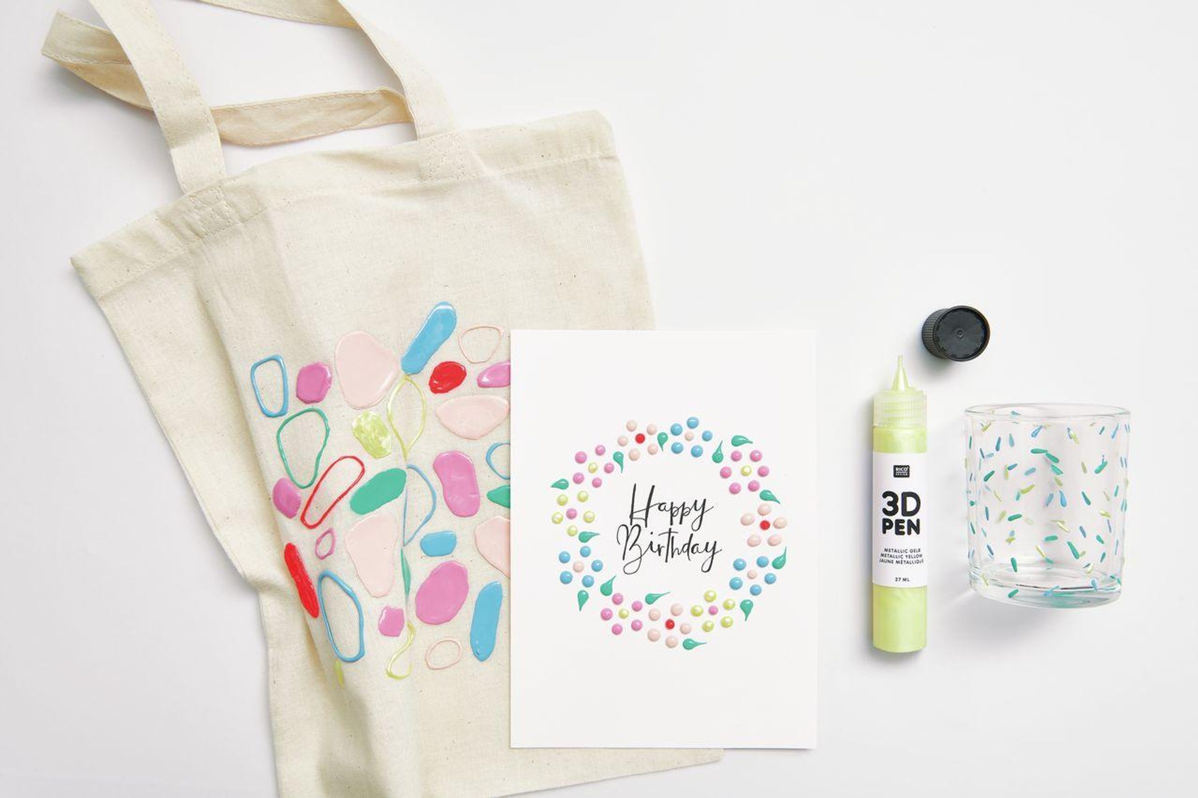"3D Pen", "1 Pastel Colours", "6 Pens", "Happy Birthday". Sechs pastellfarbene Stifte werden gezeigt., Diverse