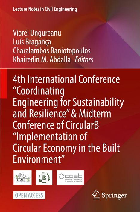 This open access book gathers the proceedings of the 4th International Conference "Coordinating Engineering for Sustainability and Resilience" (CESARE) & Midterm Conference of CircularB "Implementation of Circular Economy in the Built Environment", held in Timi¿oara, Romania, on May 29-31, 2024, as part of the COST Action CA21103. The volume represents the state of the art of sustainability and resilience in modern and future built environment, constructions, and infrastructure, and includes topics such as structural materials and robustness, fire engineering, risk assessment, impact of climate change on the built environment, sustainable resilience of systems in the built environment, smart cities, circular economy, design strategies for product design, integration of renewable energy at building and small urban area scales, restoration & rehabilitation of historical buildings, sustainable infrastructures, wind energy structures, façade engineering, green buildings, and waste management.