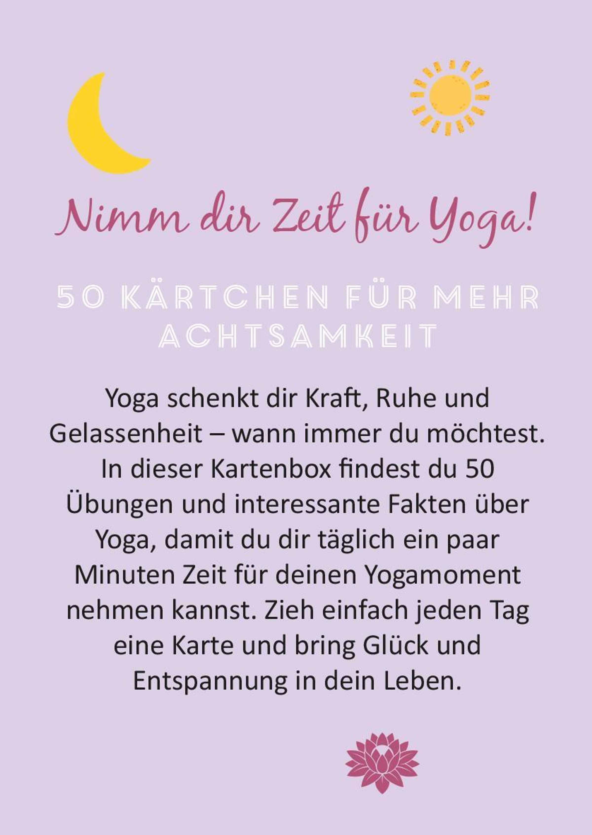 - Motivation für 50 x Yoga: Die schön gestalteten Spielkarten zeigen dir bekannte und neue Haltungen aus dem Yoga, vom herabschauenden Hund bis hin zum Baum