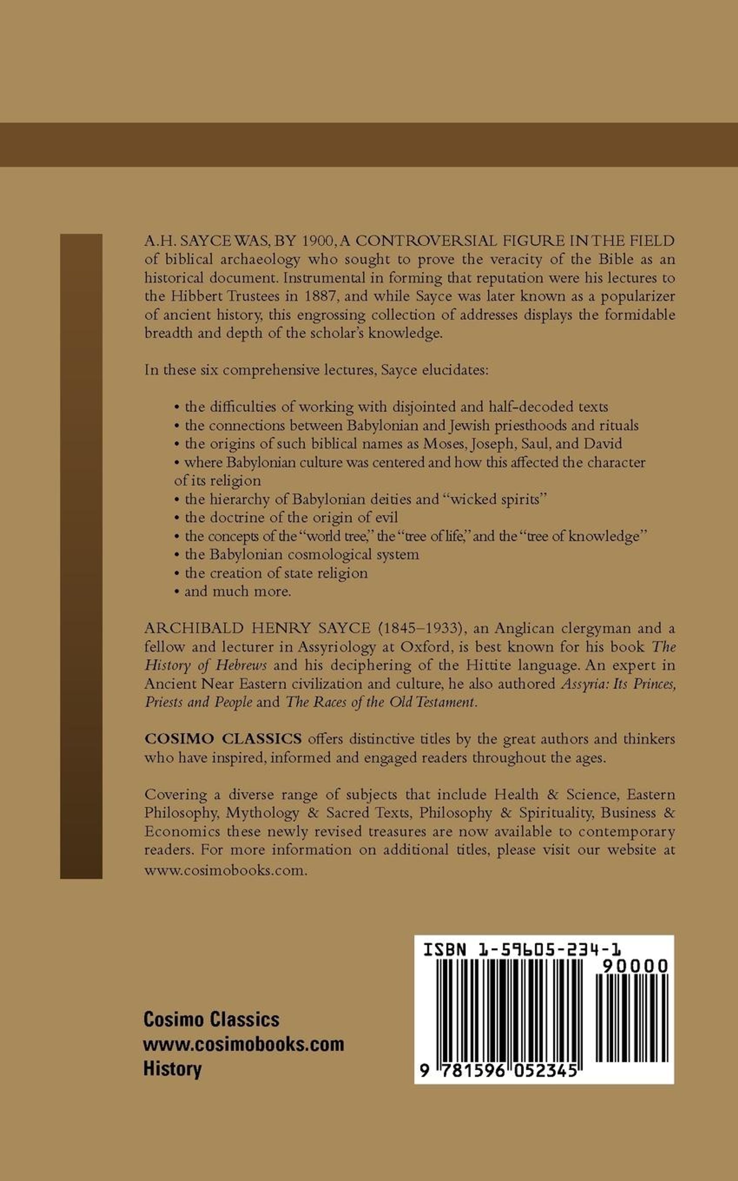 A. H. Sayce was, by 1900, a controversial figure in the field of biblical archaeology who sought to prove the veracity of the Bible as an historical document. Instrumental in forming that reputation were his lectures to the Hibbert Trustees in 1887, and while Sayce was later known as a popularizer of ancient history, this engrossing collection of addresses displays the formidable breadth and depth of the scholar's knowledge.