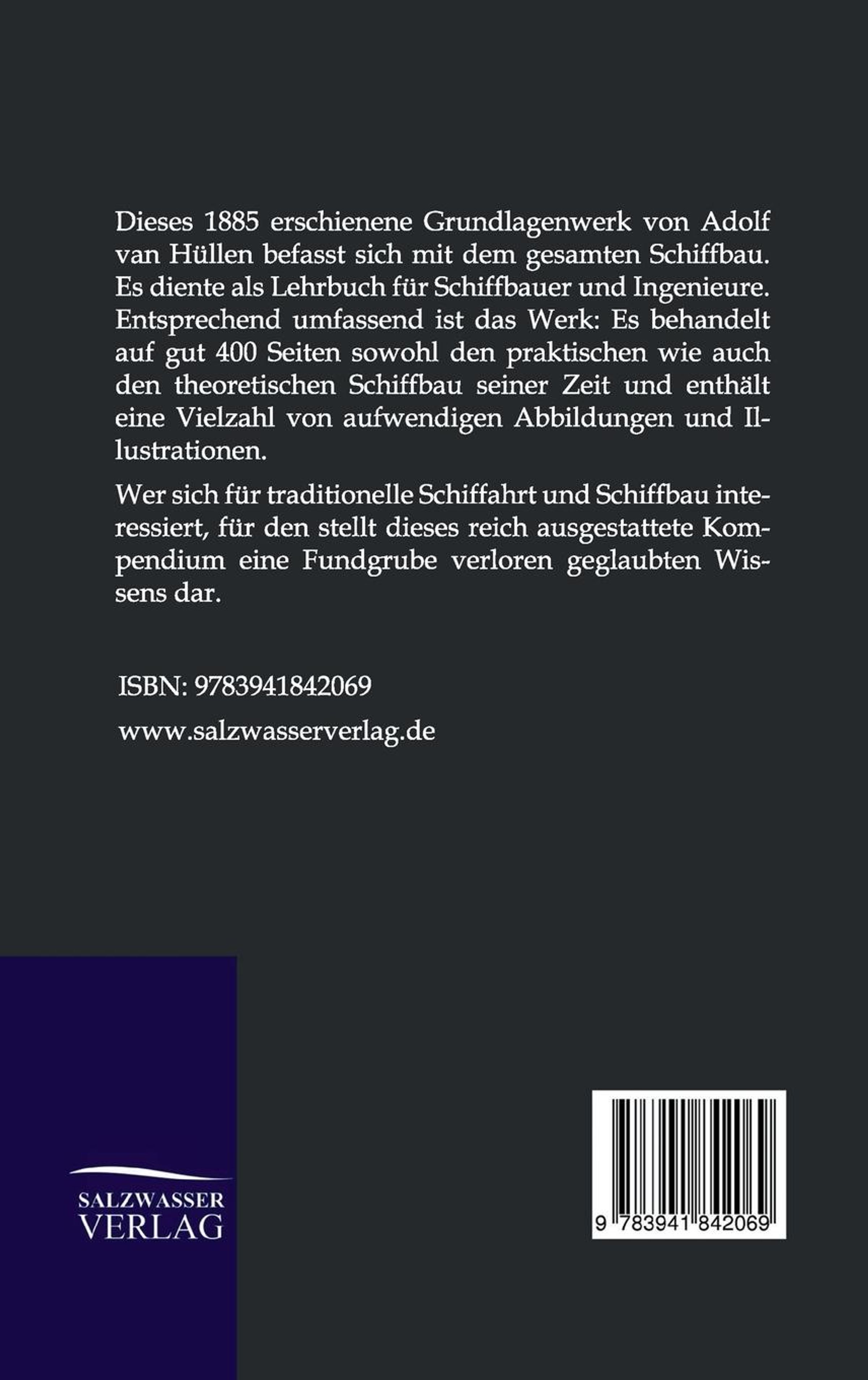 Dieses 1885 erschienene Grundlagenwerk von Adolf van Hüllen befasst sich mit dem gesamten Schiffbau. Es diente als Lehrbuch für Schiffbauer und Ingenieure. Entsprechend umfassend ist das Werk: Es behandelt auf gut 400 Seiten sowohl den praktischen wie auch den theoretischen Schiffbau seiner Zeit und enthält eine Vielzahl von aufwendigen Abbildungen und Illustrationen. Wer sich für traditionelle Schiffahrt und Schiffbau interessiert, für den stellt dieses reich ausgestattete Kompendium eine Fundgrube verloren geglaubten Wissens dar.