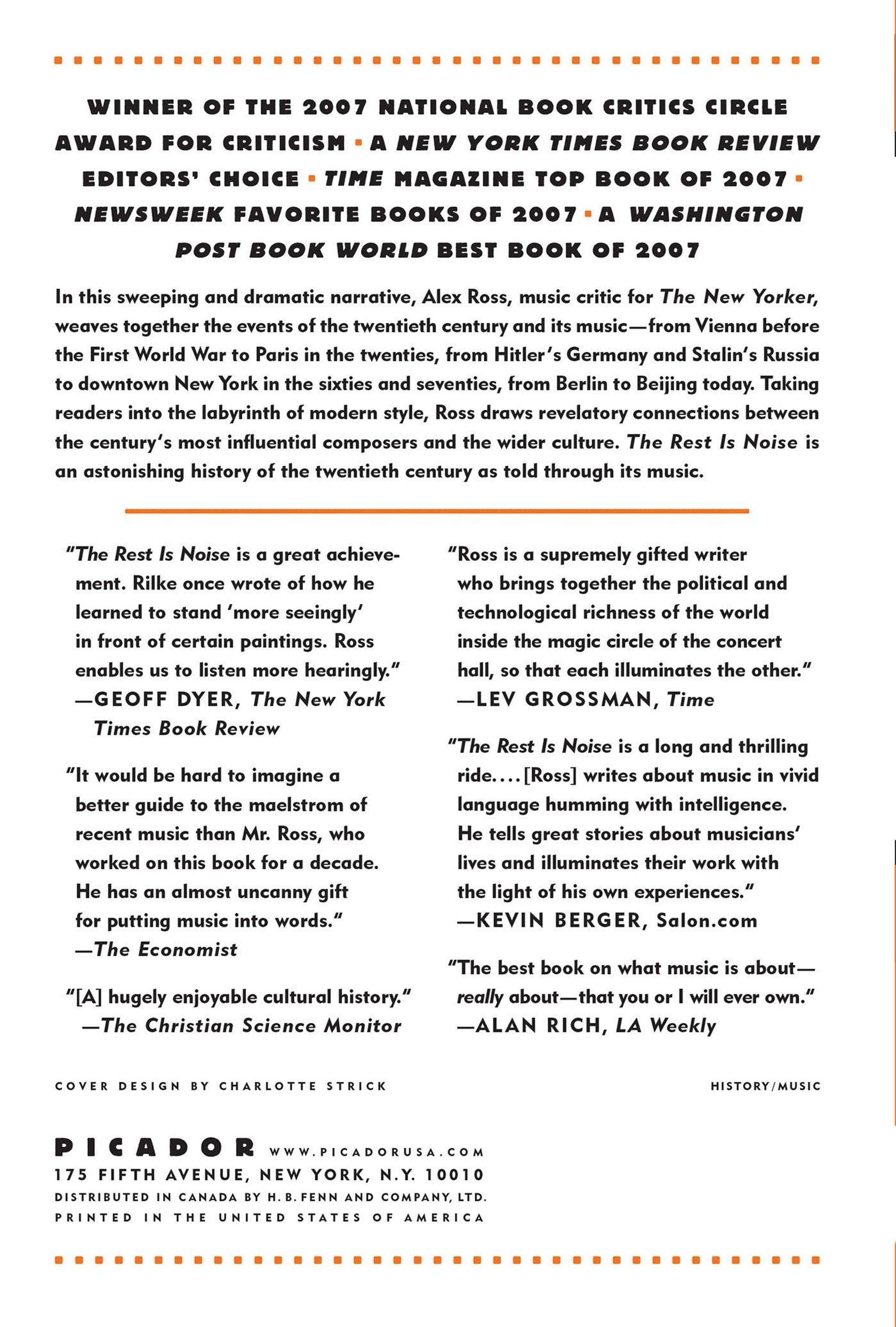 In this sweeping and dramatic narrative, Alex Ross, music critic for The New Yorker , weaves together the histories of the twentieth century and its music, from Vienna before the First World War to Paris in the twenties; from Hitler's Germany and Stalin's Russia to downtown New York in the sixties and seventies up to the present. Taking readers into the labyrinth of modern style, Ross draws revelatory connections between the century's most influential composers and the wider culture. The Rest Is Noise is an astonishing history of the twentieth century as told through its music.