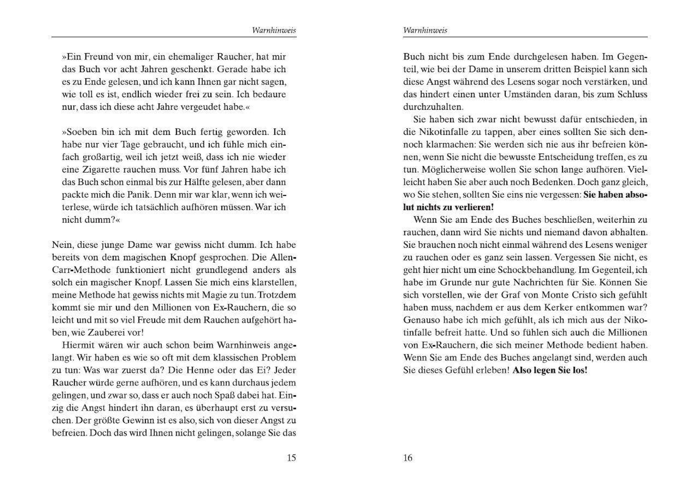 Allen Carr war ursprünglich Wirtschaftsprüfer. Seit er sich selbst und Millionen anderer Raucher von der Nikotinabhängigkeit befreit hat, beschäftigt er sich hauptberuflich damit, Menschen auf sanfte, aber effektive Weise zu helfen, Suchtfallen und zwanghaften Verhaltensweisen zu entkommen, sei es nun Rauchen, Übergewicht, Alkohol oder Flugangst. Durch den riesigen, nachweislichen Erfolg seiner Selbsthilfe-Methode erlangte Carr internationales Ansehen. Seine Vorgehensweise wird weltweit von Ärzten unterstützt und es gibt in vielen Ländern Carr-Standorte mit speziell ausgebildeten Trainern.Anmerkungen: