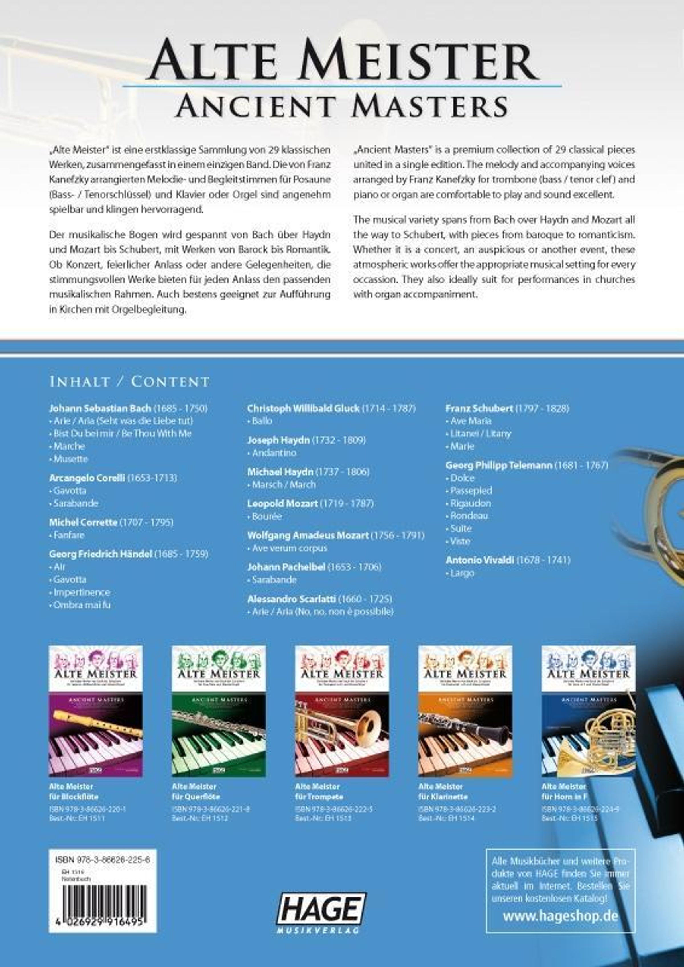 "Alte Meister" ist eine erstklassige Sammlung von 29 klassischen Werken, zusammengefasst in einem einzigen Band. Die von Franz Kanefzky arrangierten Melodie- und Begleitstimmen für Posaune (Bass-/Tenorschlüssel) und Klavier oder Orgel sind angenehm spielbar und klingen hervorragend.