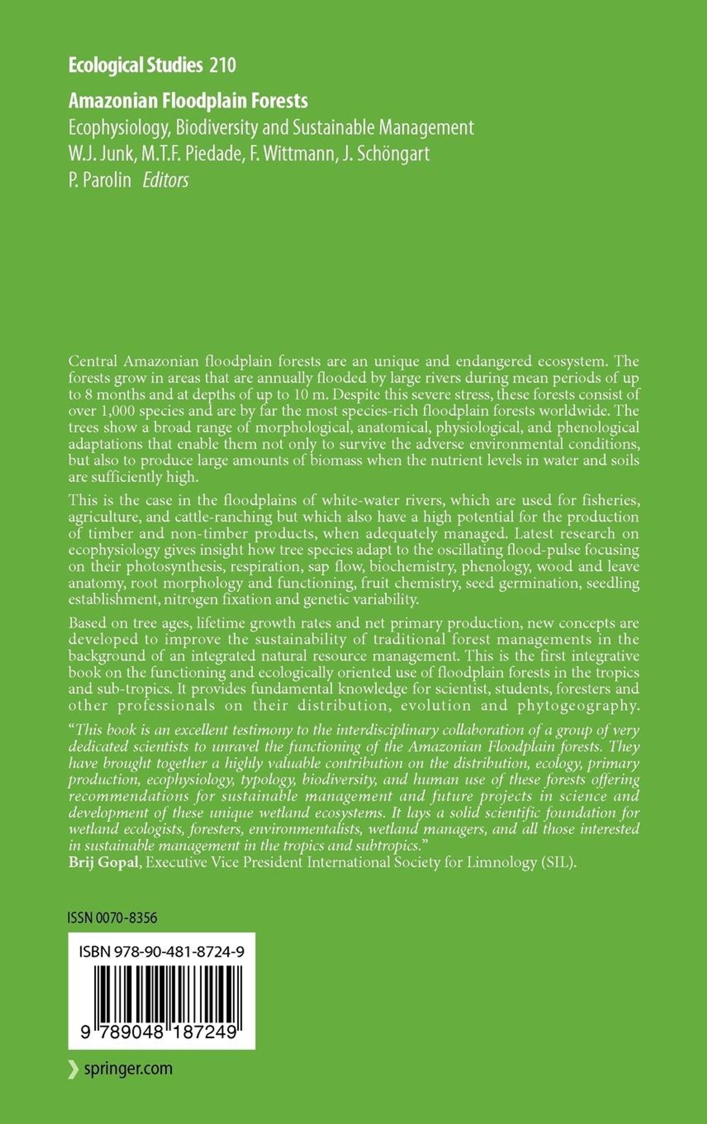 This book is an excellent testimony to the interdisciplinary collaboration of a group of very dedicated scientists to unravel the functioning of the Amazonian Floodplain forests. They have brought together a highly valuable contribution on the distribution, ecology, primary production, ecophysiology, typology, biodiversity, and human use of these forests offering recommendations for sustainable management and future projects in science and development of these unique wetland ecosystems. It lays a solid scientific foundation for wetland ecologists, foresters, environmentalists, wetland managers, and all those interested in sustainable management in the tropics and subtropics. Brij Gopal, Executive Vice President International Society for Limnology (SIL).