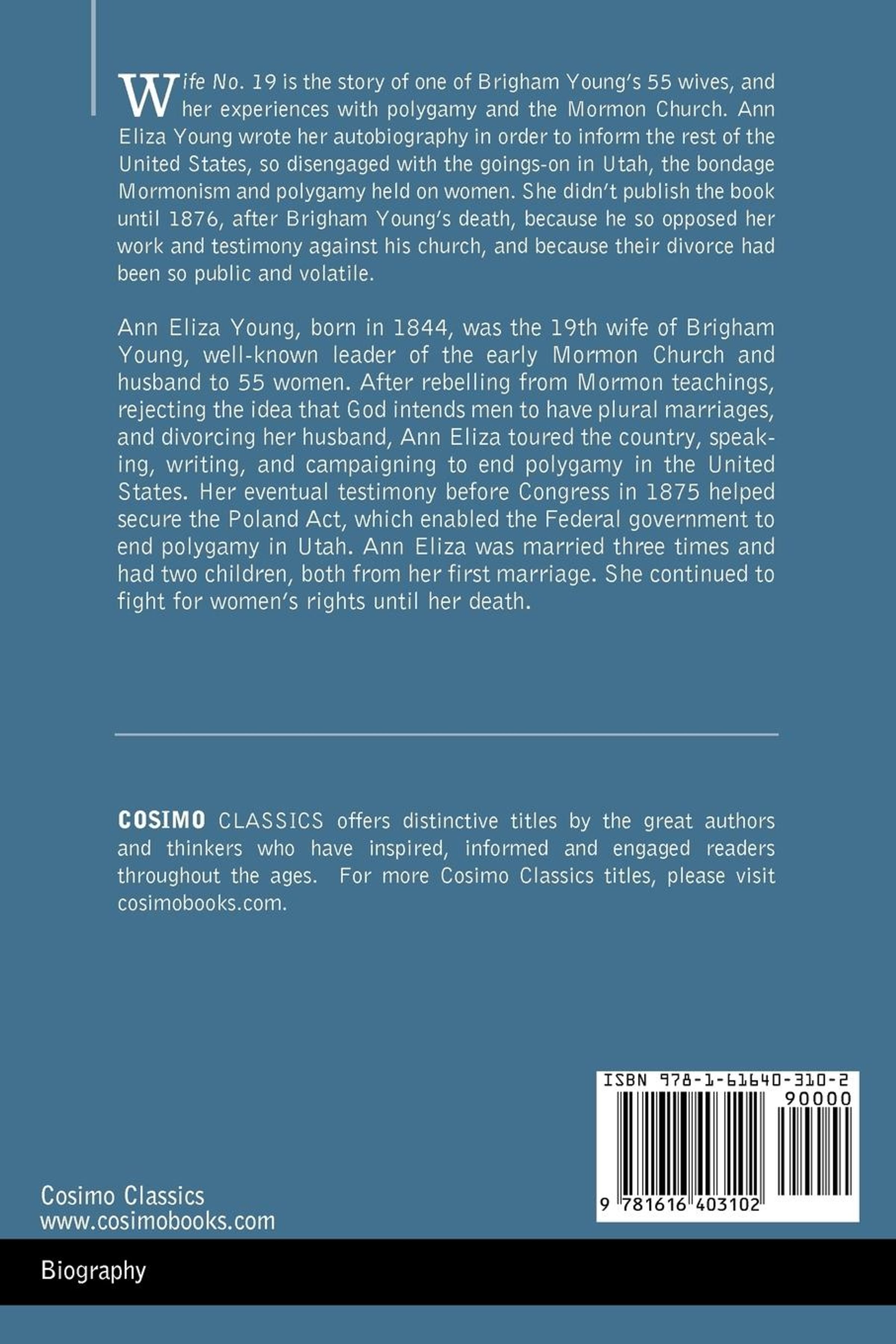 Wife No. 19 is the story of one of Brigham Young's 55 wives, and her experiences with polygamy and the Mormon Church. Ann Eliza Young wrote her autobiography in order to inform the rest of the United States, so disengaged with the goings-on in Utah, the bondage Mormonism and polygamy held on women. She didn't publish the book until 1876, after Brigham Young's death, because he so opposed her work and testimony against his church, and because their divorce had been so public and volatile.