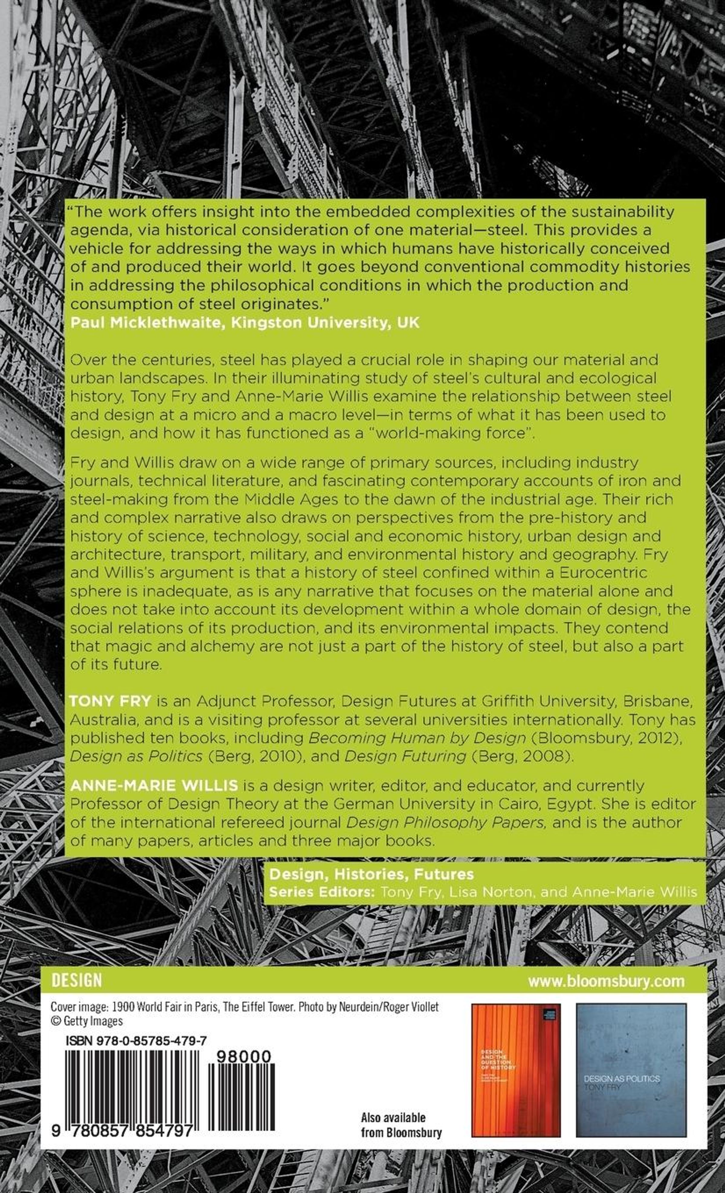Steel has, over centuries, played a crucial role in shaping our material, and in particular, urban landscapes. This books undertakes a cultural and ecological history of the material, examining the relationship between steel and design at a micro and macro level - in terms of both what it has been used to design and how it has functioned as a 'world-making force'.The research for the book is informed by diverse sources including industry journals, contemporary accounts and technical literature - all framed by rich, early accounts of iron and steel making from the middle ages to the opening of the industrial age, and most notably, the crucial works of Vannoccio Biringuccio, Georgius Agricola, Andrew Ure and Harry Scrivenor. In contrast, trans-cultural accounts of the history of metallurgy from eminent sinologists and cultural historians like Joseph Needham and G. E.R. Lloyd are used. Readings on the pre-history and history of science, as well as histories and philosophies technology from scholars such as Siegfried Giedion, Merritt Roe Smith, L. T.C Rolt, Robert B. Gordon inform the analysis. Social and economic history from historians such as Eric Hobsbawn, William T. Hogan and David Brody are consulted; labour process theory is also examined, particularly the influential writings of F. W. Taylor in the late 19th and early 20th centuries and his contemporary critics, like David Nobel and Harry Braverman. Many other disciples also inform the account: histories of urban design and architecture, transport and military history, environmental history and geography.