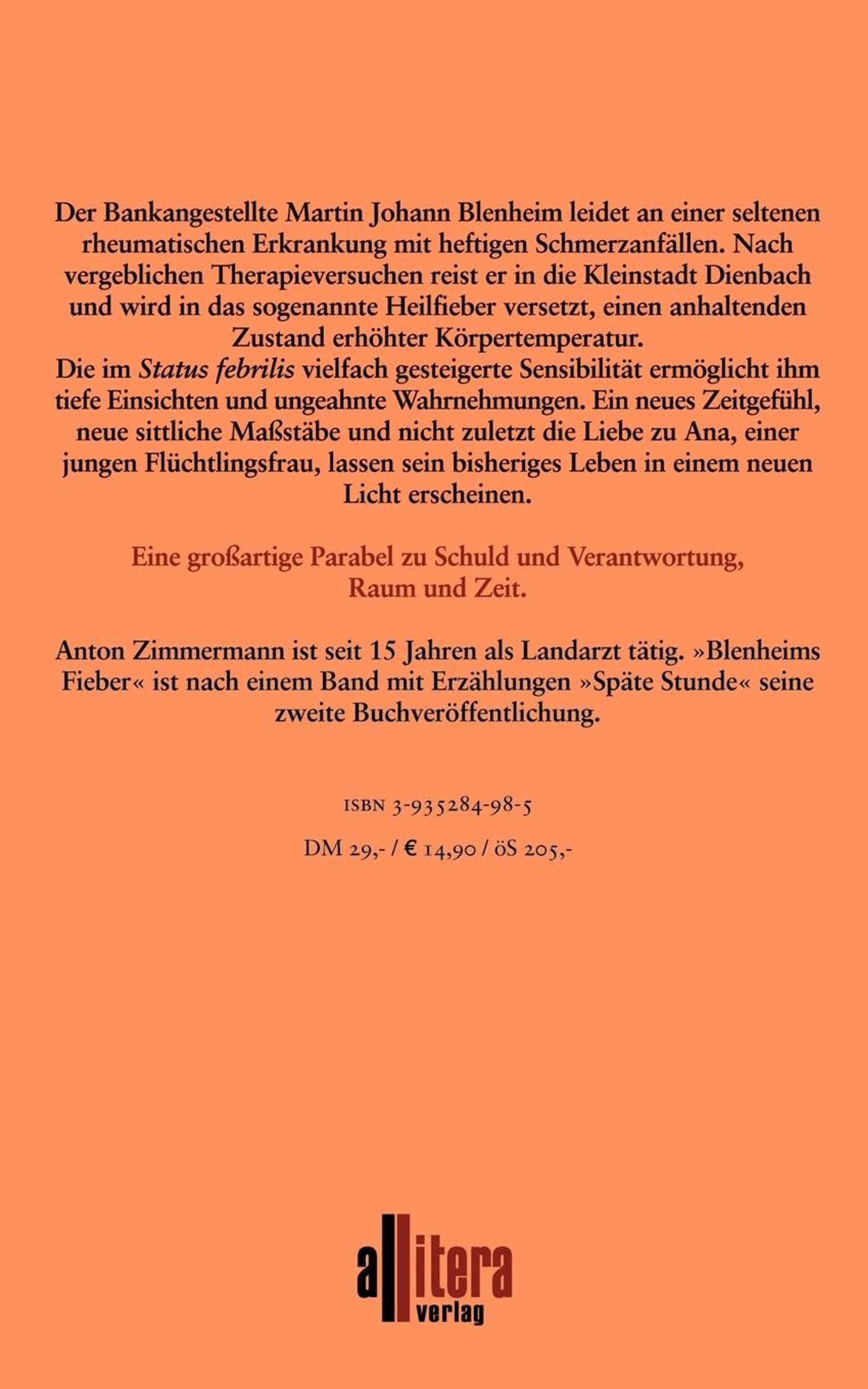 Der Bankangestellte Martin Johann Blenheim leidet an einer seltenen rheumatischen Erkrankung mit heftigsten Schmerzanfällen. Nach vergeblichen Therapieversuchen reist er in die Kleinstadt Dienbach und wendet sich an einen Arzt, der unkonventionelle Heilmethoden einsetzt. Blenheim wird in das Heilfieber versetzt, einen anhaltenden Zustand erhöhter Körpertemperatur. Die im Status febrilis vielfach gesteigerte Sensibilität ermöglicht ihm tiefe Einsichten und ungeahnte Wahrnehmungen. Ein neues Zeitgefühl, neue sittliche Maßstäbe lassen sein bisheriges Leben als fragwürdig erscheinen. Die Liebe zu Ana, einer jungen Frau aus dem Süden des Kontinents, die mit anderen Leidensgenossen durch einen Bürgerkrieg nach Dienbach verschlagen wurde, öffnet Blenheim die Augen für die Not seiner Mitmenschen. Als Ana die Aufenthaltsgenehmigung entzogen wird, trifft Blenheim die Entscheidung für sein zukünftiges Leben. Eine großartige Parabel zu Schuld und Verantwortung, zu Raum und Zeit.