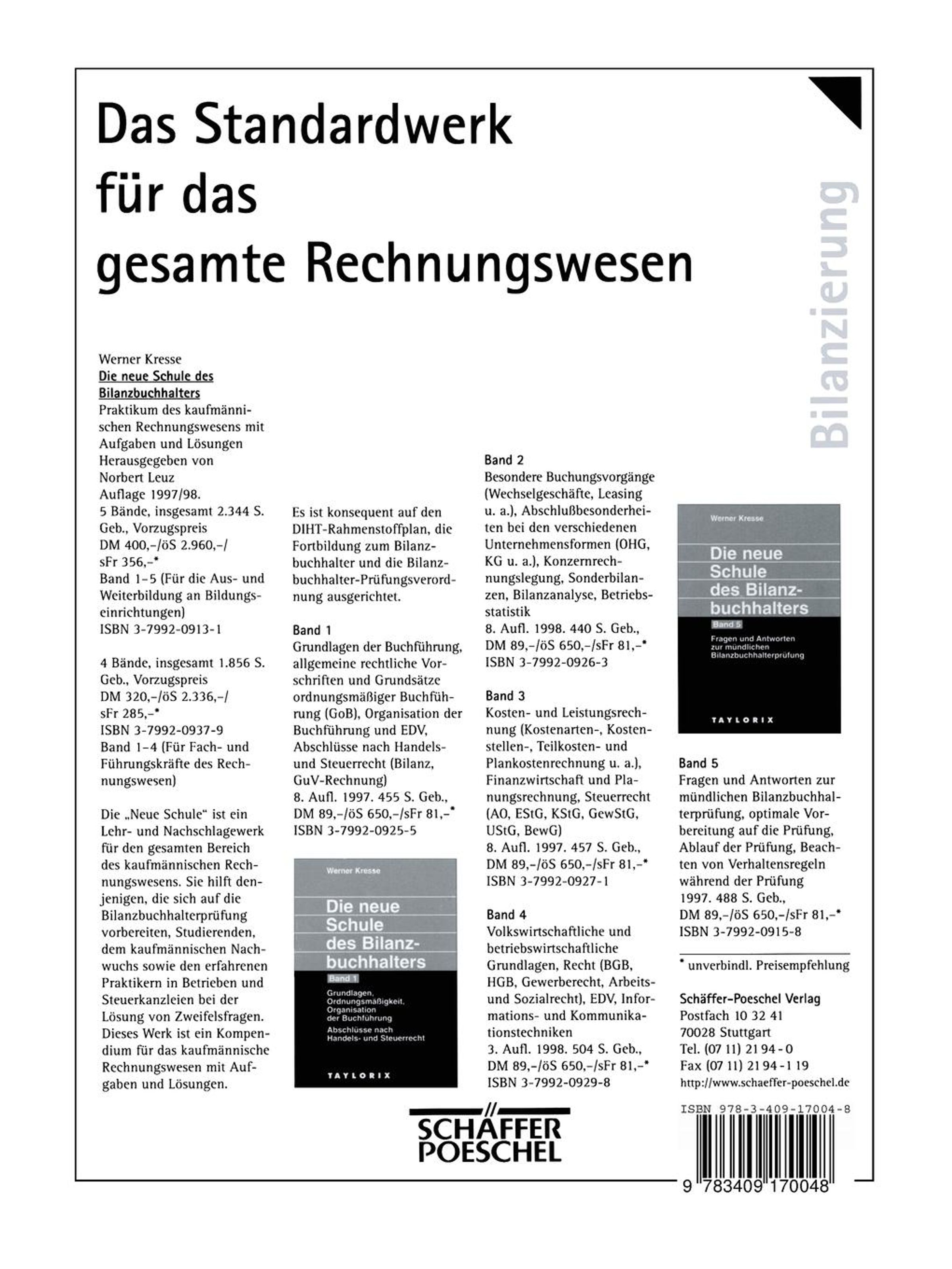 Die optimale Vorbereitung auf die Bilanzbuchhalterprüfung (IHK-Abschluß). Dieses Werk bietet Aufgaben und Lösungen aus allen Prüfungsfächern: Buchführung, Kosten- und Leistungsrechnung, Steuerrecht, Finanzierung, Volkswirtschaftslehre, Betriebswirtschaftslehre, EDV, Recht. Es bündelt Übungen, die zwischen 1995 und 1997 in der Zeitschrift bilanz & buchhaltung erschienen sind.