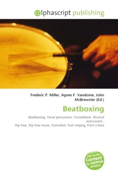 Please note that the content of this book primarily consists of articles available from Wikipedia or other free sources online. Beatboxing is a form of vocal percussion which primarily involves the art of producing drum beats, rhythm, and musical sounds using one's mouth, lips, tongue and voice. It may also involve singing, vocal imitation of turntablism, the simulation of horns, strings, and other musical instruments. Beatboxing is connected with hip hop culture although it is not limited to hip hop music.