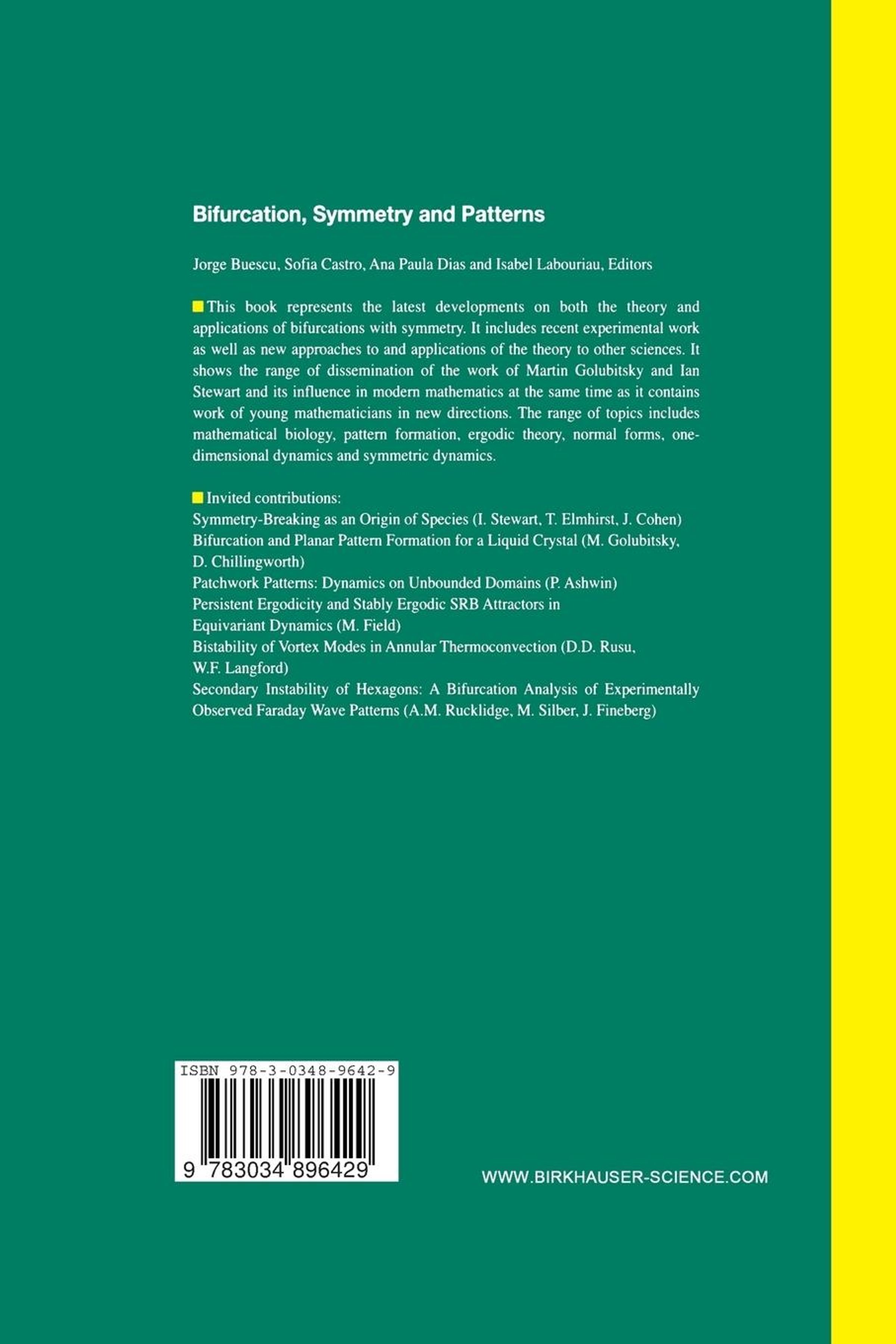 This book represents the latest developments on both the theory and applications of bifurcations with symmetry. It includes recent experimental work as well as new approaches to and applications of the theory to other sciences. It shows the range of dissemination of the work of Martin Golubitsky and Ian Stewart and its influence in modern mathematics at the same time as it contains work of young mathematicians in new directions. The range of topics includes mathematical biology, pattern formation, ergodic theory, normal forms, one-dimensional dynamics and symmetric dynamics.