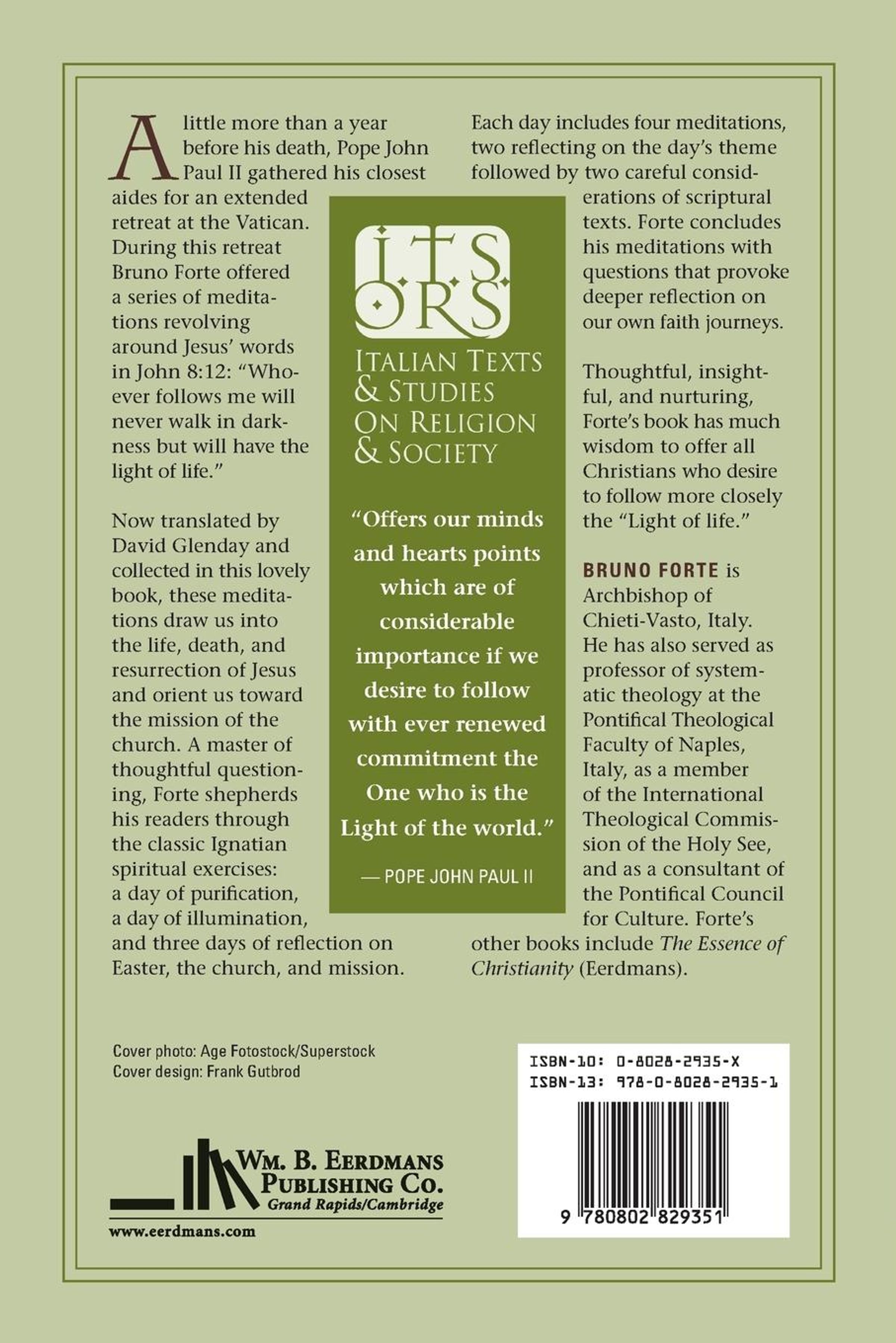 A little more than a year before his death, Pope John Paul II gathered his closest aides for an extended retreat at the Vatican. During this retreat Bruno Forte offered a series of meditations revolving around Jesus' words in John 8: 12: "Whoever follows me will never walk in darkness but will have the light of life."