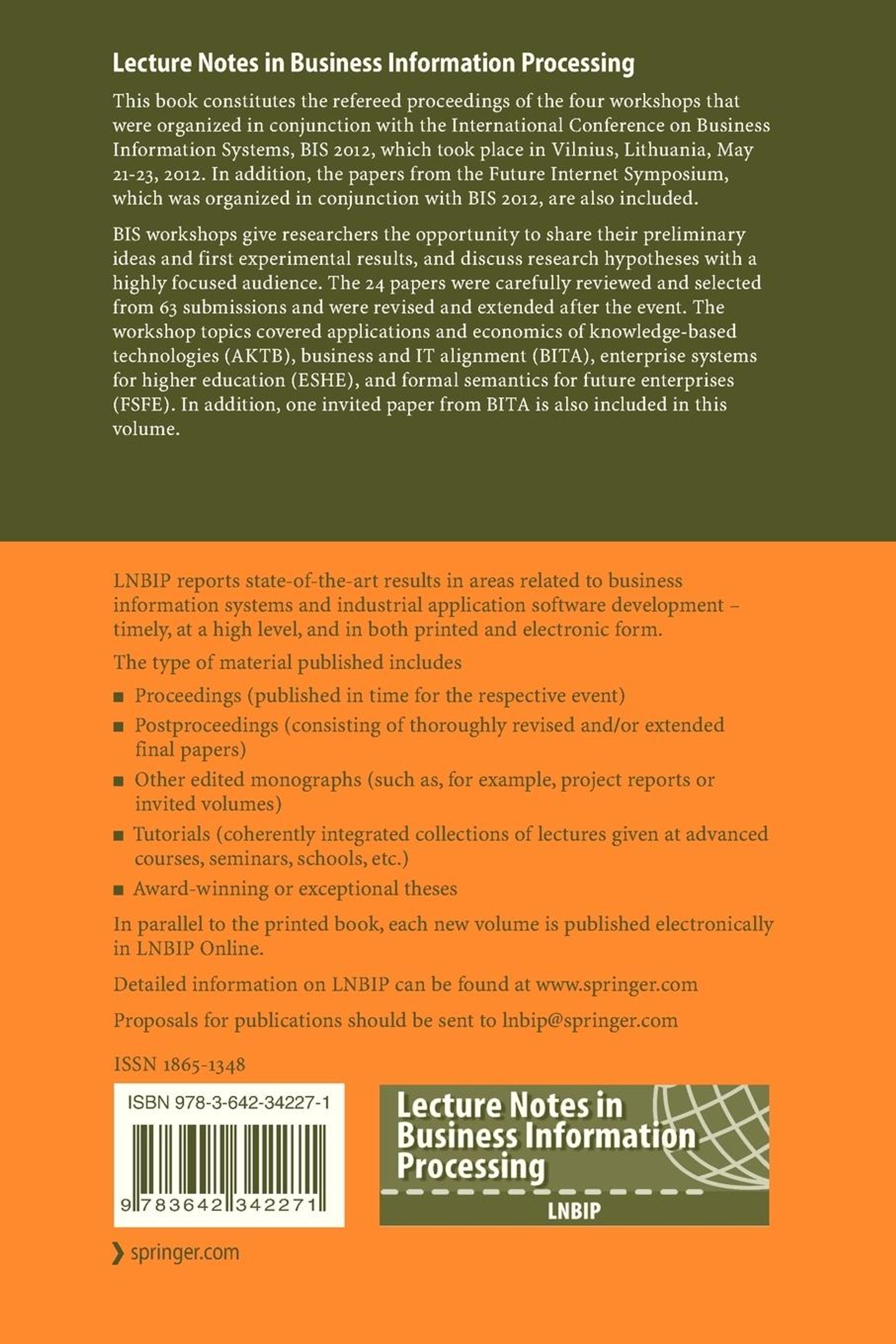 This book constitutes the refereed proceedings of the four workshops that were organized in conjunction with the International Conference on Business Information Systems, BIS 2012, which took place in Vilnius, Lithuania, May 21-23, 2012. In addition, the papers from the Future Internet Symposium, which was organized in conjunction with BIS 2012, are also included. BIS workshops give researchers the opportunity to share their preliminary ideas and first experimental results, and discuss research hypotheses with a highly focused audience. The 24 papers were carefully reviewed and selected from 63 submissions and were revised and extended after the event. The workshop topics covered applications and economics of knowledge-based technologies (AKTB), business and IT alignment (BITA), enterprise systems for higher education (ESHE), and formal semantics for future enterprises (FSFE). In addition, one invited paper from BITA is also included in this volume.