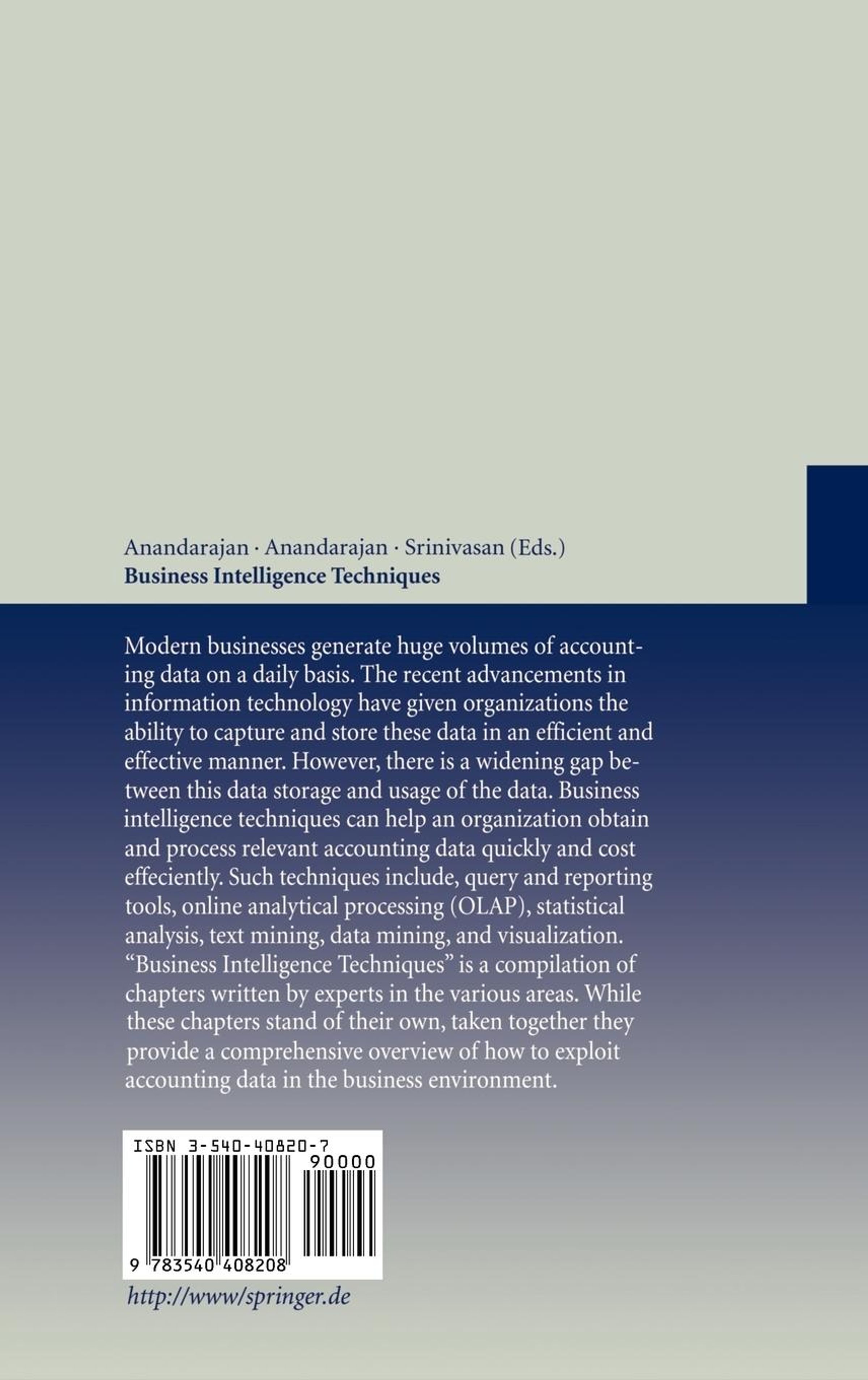 Business intelligence techniques can help an organization obtain and process relevant accounting data quickly and cost efficiently. Such techniques include, query and reporting tools, online analytical processing (OLAP), statistical analysis, text mining, data mining, and visualization. Business Intelligence Techniques is a compilation of chapters written by experts in these various areas. While these chapters stand of their own, taken together they provide a comprehensive overview of how to exploit accounting data in the business environment.
