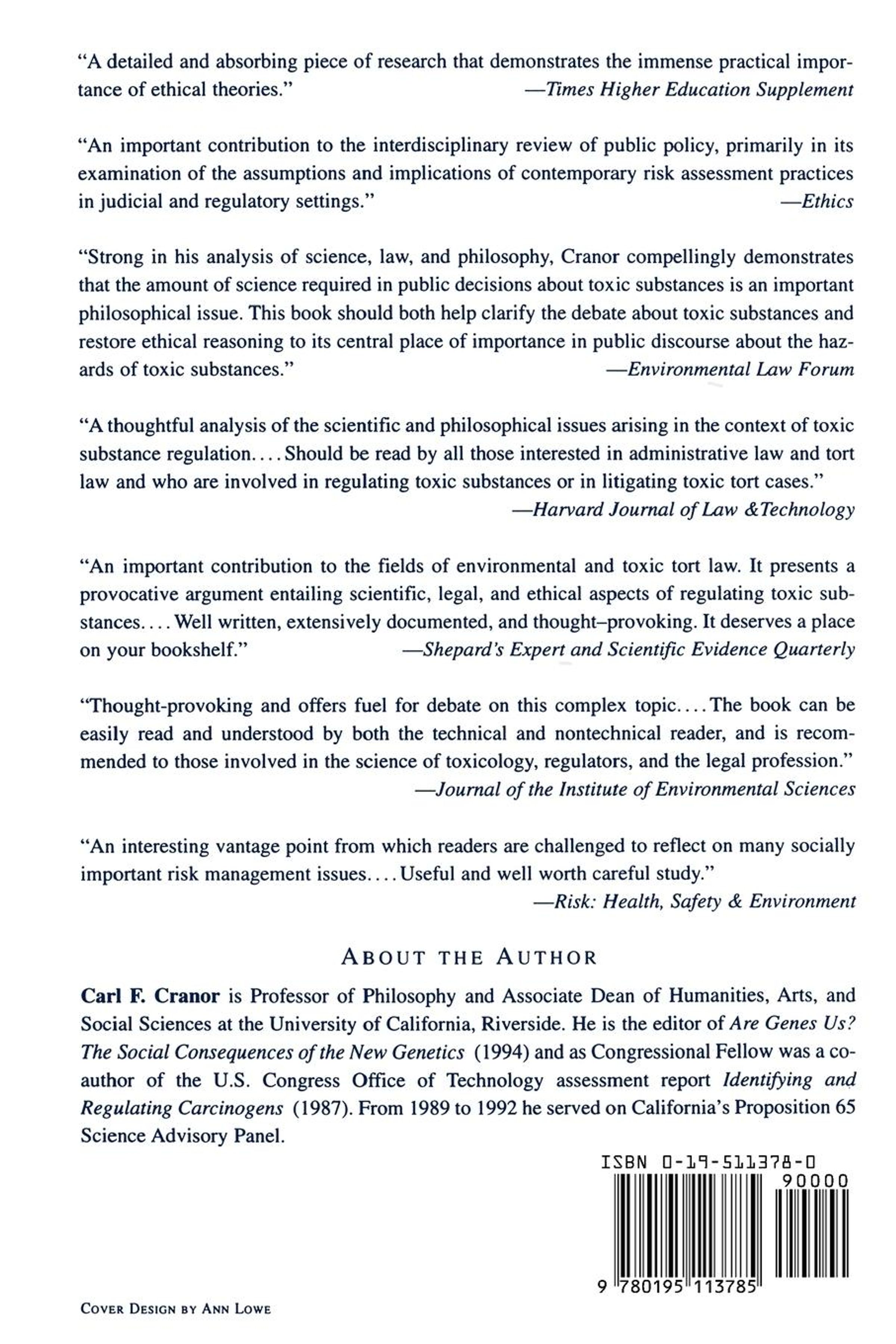 Toxic substances, such as carcinogens, pose threats to human health and well-being. Whether such threats are substantial and our response to them if they are present major scientific and philosophical issues. Yet such substances pose special problems. They are invisible, typically undetectable intruders that can harm us in ways we might not discover for years.