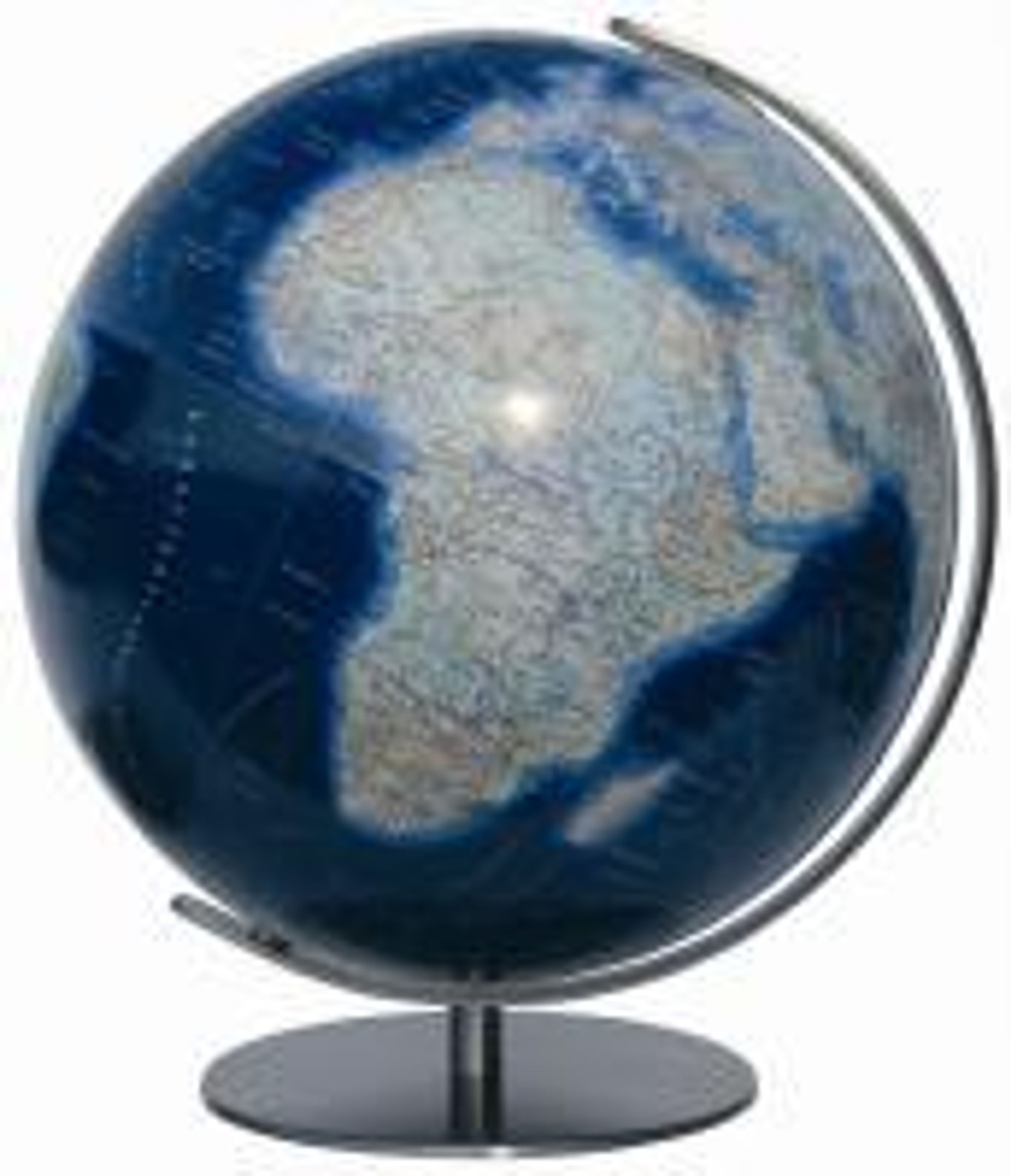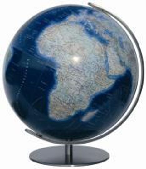 DUO AZZURRO Leuchtglobus, 34 cm Acrylglaskugel, handkaschiert, Meridian und Fuss Edelstahl matt gebuerstet, unbeleuchtet politisch, beleuchtet physisch mit Reliefschummerung von Bergen und Taelern