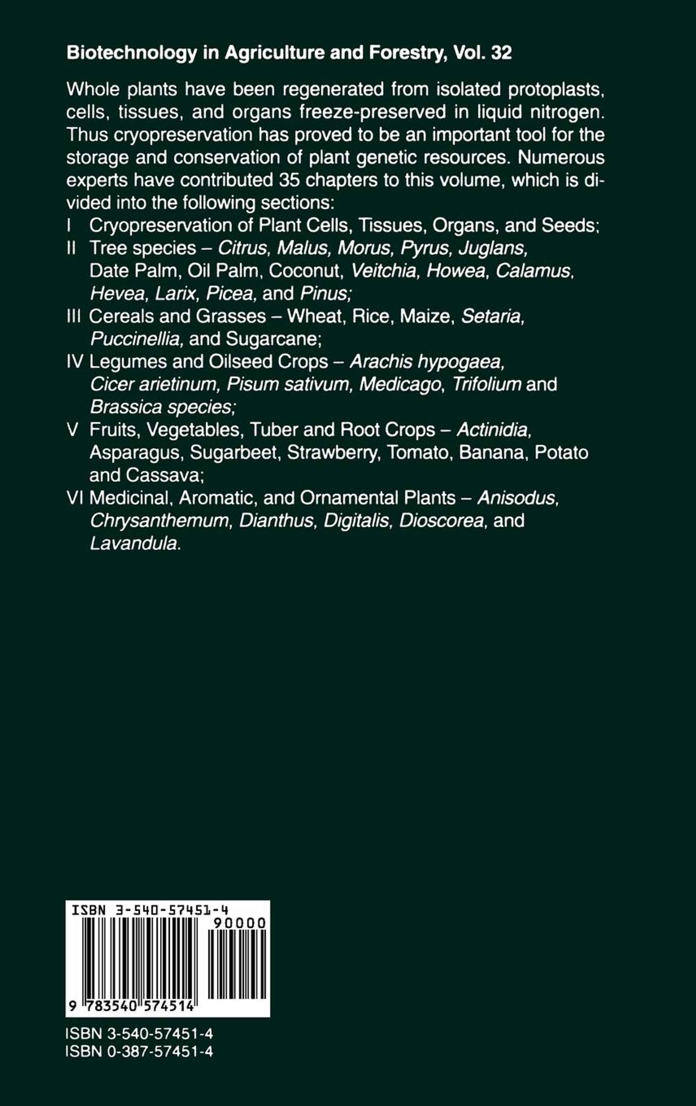 The germ plasm of numerous plant species, especially those of forest trees, some agricultural crops, and medicinal plants, is endangered and threatened with extinction. This depletion of germplasm pools and the shrinkage of naturally occurring genetic resources have caused international concern. Conventionally, the germplasm of plants is conserved through seeds, tubers, roots, corms, rhizomes, bulbs, cuttings, etc. However, the germ plasm of a number of trees and plantation crops (such as coconut, cocao, coffee, oil palm, rubber, mango, horse chestnut, etc. ) cannot be preserved since their seed are short-lived (recalcitrant). Likewise, germplasm of vegetatively propagated crops (such as potato and cassava) cannot be stored on a long term basis and has to be grown and multiplied periodically in nurseries and fields. The plants are thus exposed to unpredictable weather conditions and diseases, with the result that instances are known where entire genetic stocks are lost. Therefore, unconventional methods are being developed for the storage and international exchange of germplasm. For this purpose in vitro cultures have been employed, but they can only enable short-to medium term preservation; moreover, cell cultures upon repeated subculture undergo genetic erosion. In view of the recent developments in the in vitro induction of genetic variability through somaclonal variation, somatic hybridization, recombinant DNA technology, etc. , new methods need to be employed for the storage of desirable cultures. In this regard freeze preservation of cells in liquid nitrogen (-196 0q, like that of semen, enables long-term storage, theoretically, for an indefinite period of time.