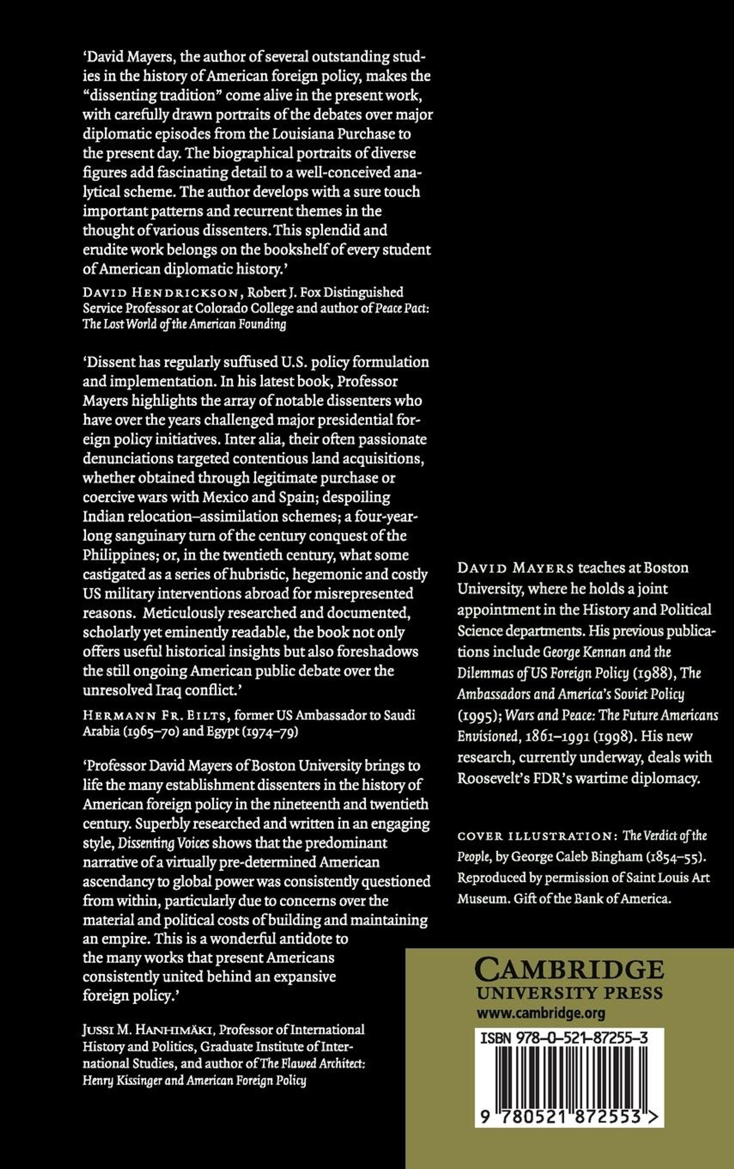 This book offers a major rereading of US foreign policy from Thomas Jefferson's purchase of Louisiana expanse to the Korean War. This period of one hundred and fifty years saw the expansion of the United States from fragile republic to transcontinental giant. David Mayers explores the dissenting voices which accompanied this dramatic ascent, focusing on dissenters within the political and military establishment and on the recurrent patterns of dissent that have transcended particular policies and crises. The most stubborn of these sprang from anxiety over the material and political costs of empire while other strands of dissent have been rooted in ideas of exigent justice, realpolitik, and moral duties existing beyond borders. Such dissent is evident again in the contemporary world when the US occupies the position of preeminent global power. Professor Mayers's study reminds us that America's path to power was not as straightforward as it might now seem.