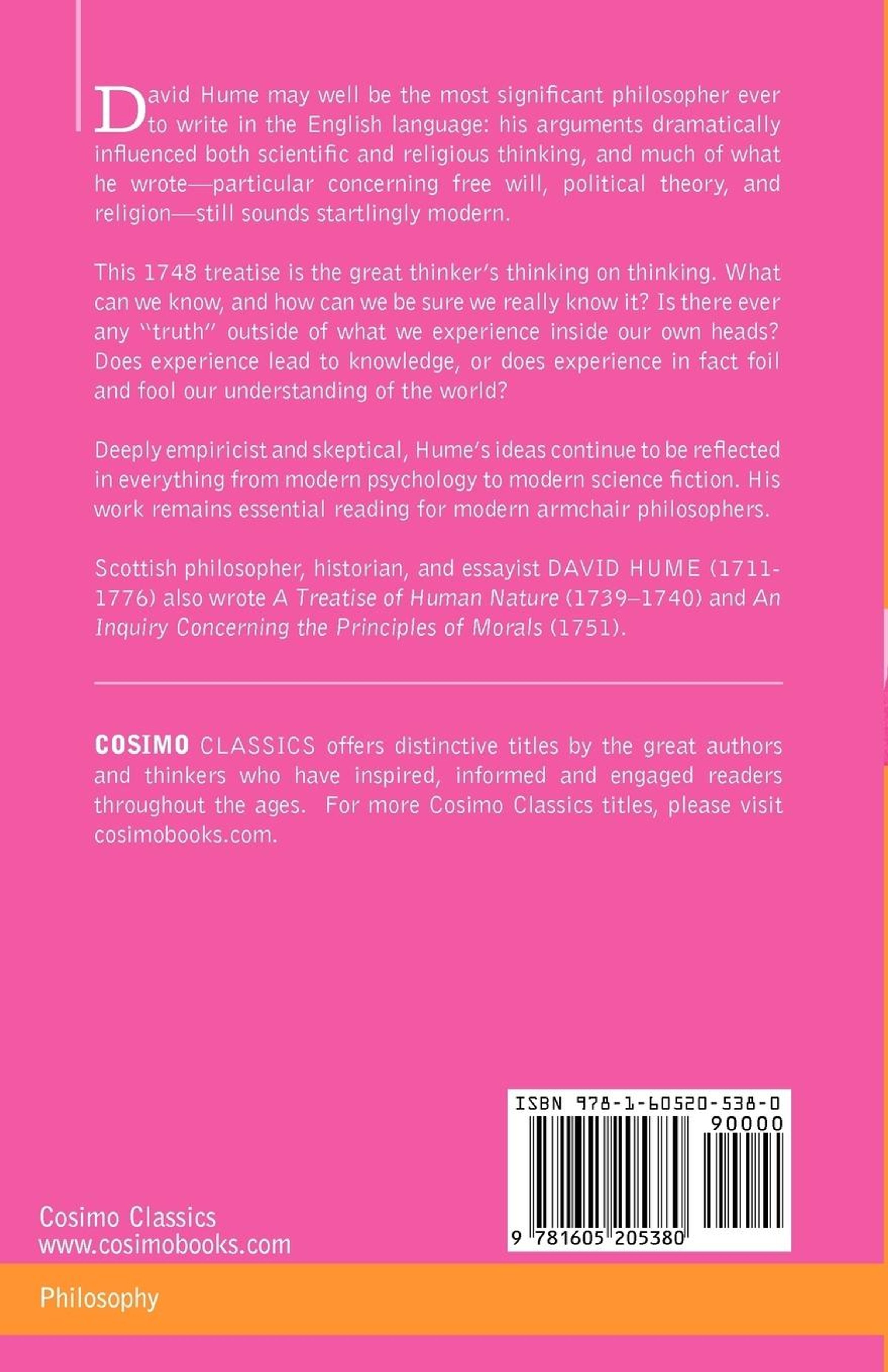 This 1748 treatise is the great thinker's thinking on thinking. What can we know, and how can we be sure we really know it? Is there ever any "truth" outside of what we experience inside our own heads? Does experience lead to knowledge, or does experience in fact foil and fool our understanding of the world?