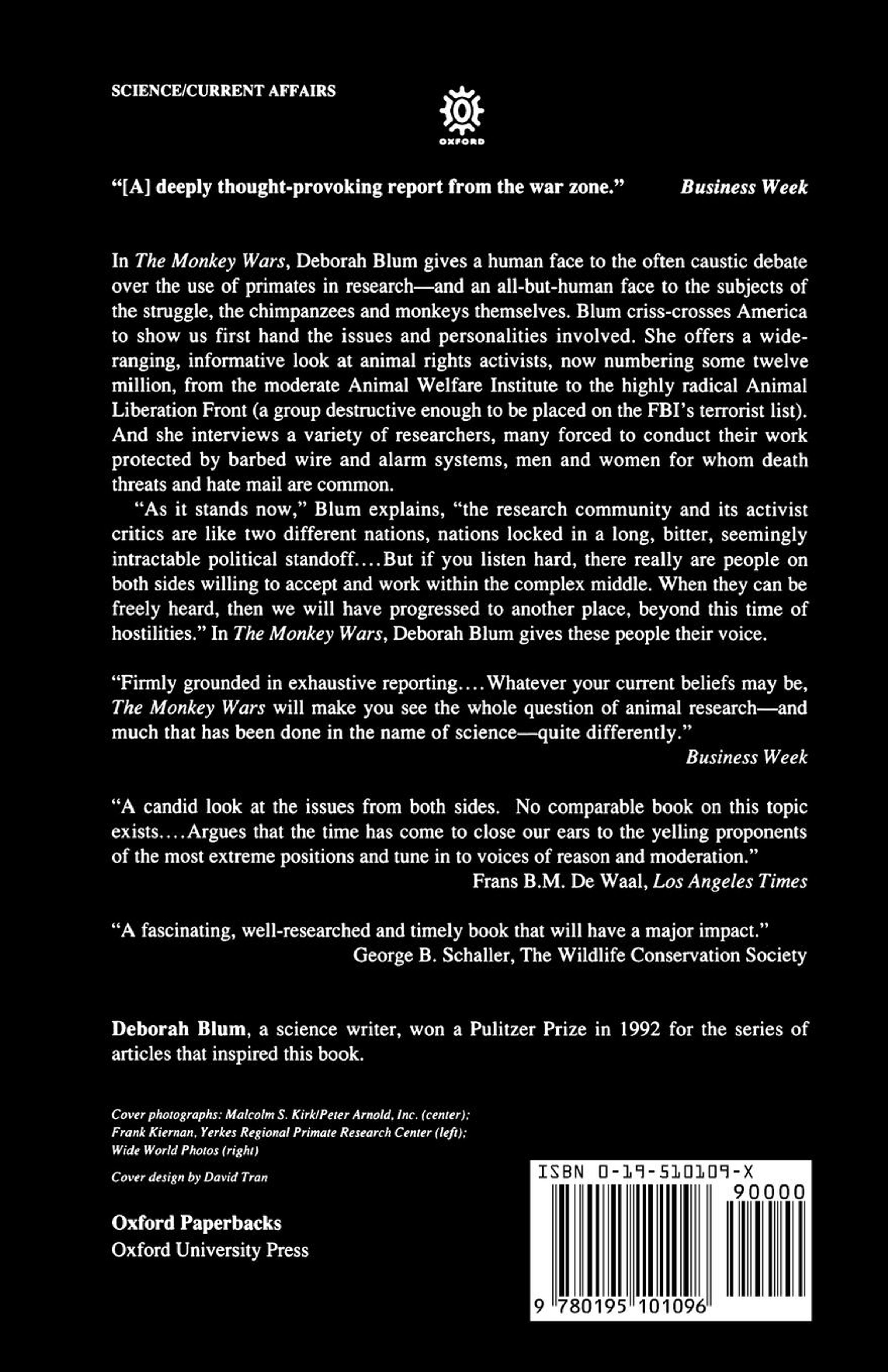 A gritty, in-the-trenches report on the battle over primate use in medical research, inspired by a series of articles by the author that won a Pulitzer Prize in 1992. Deborah Blum provides an unflinching look at the experiments that chimps and monkeys endure in research labs and gives equal accord to both researchers and animal rights activists.