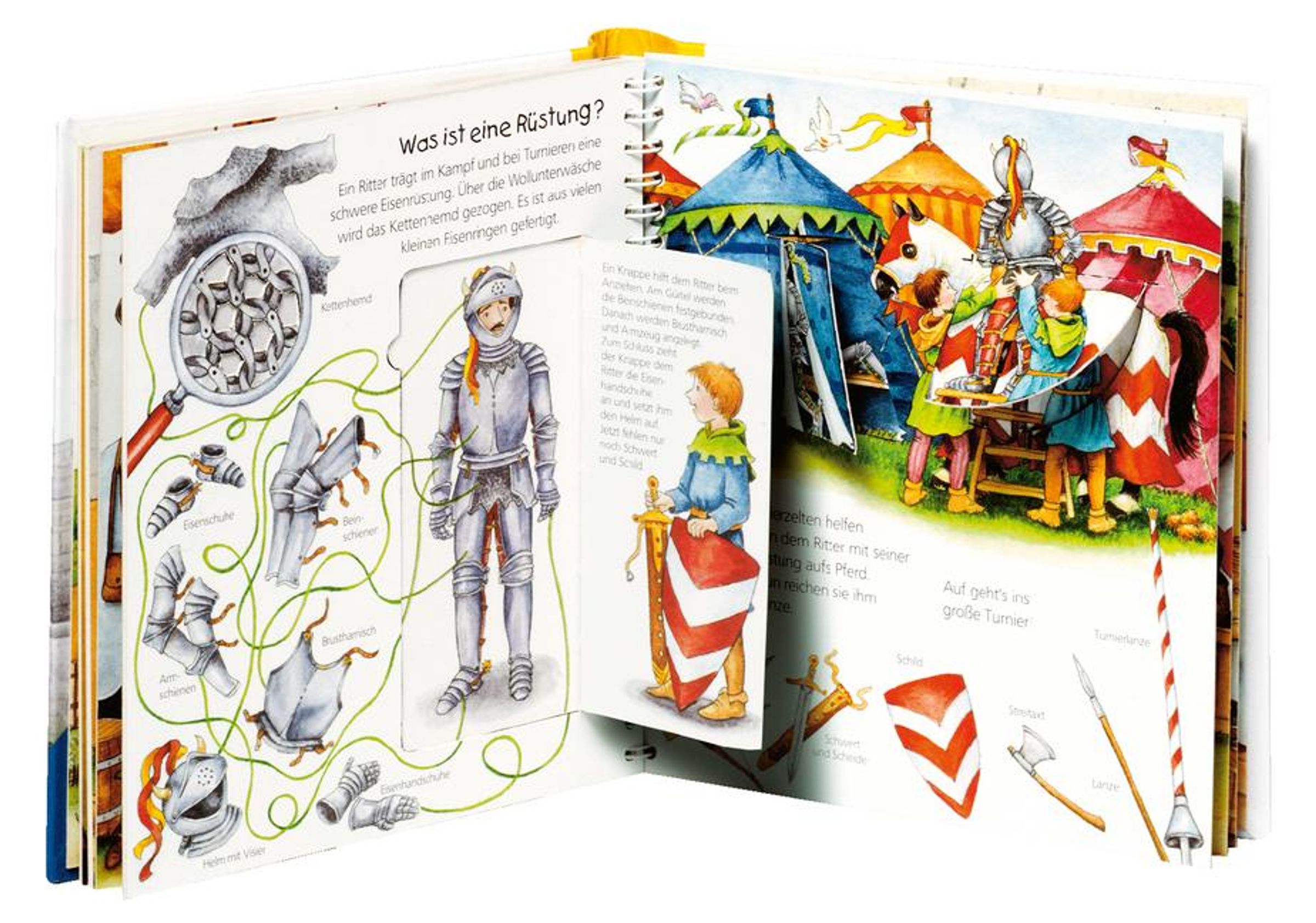 Knarrend wird die Zugbrücke heruntergelassen. Schon treten Kinder ein in die Burg von König Bodo. In ihren Türmen, Kammern und Gängen gibt es viel zu entdecken: Wer lebte wo auf der Burg? Was speisten Ritter und Burgfräulein? Und was passierte bei einem Turnier? Hier finden Kinder Antworten auf ihre Fragen. Mit Klappen legen sie dem Ritter seine Rüstung an, lassen ihn auf sein Pferd aufsteigen und verändern das bunte Treiben im Burghof. So kommt das Mittelalter ins Kinderzimmer.