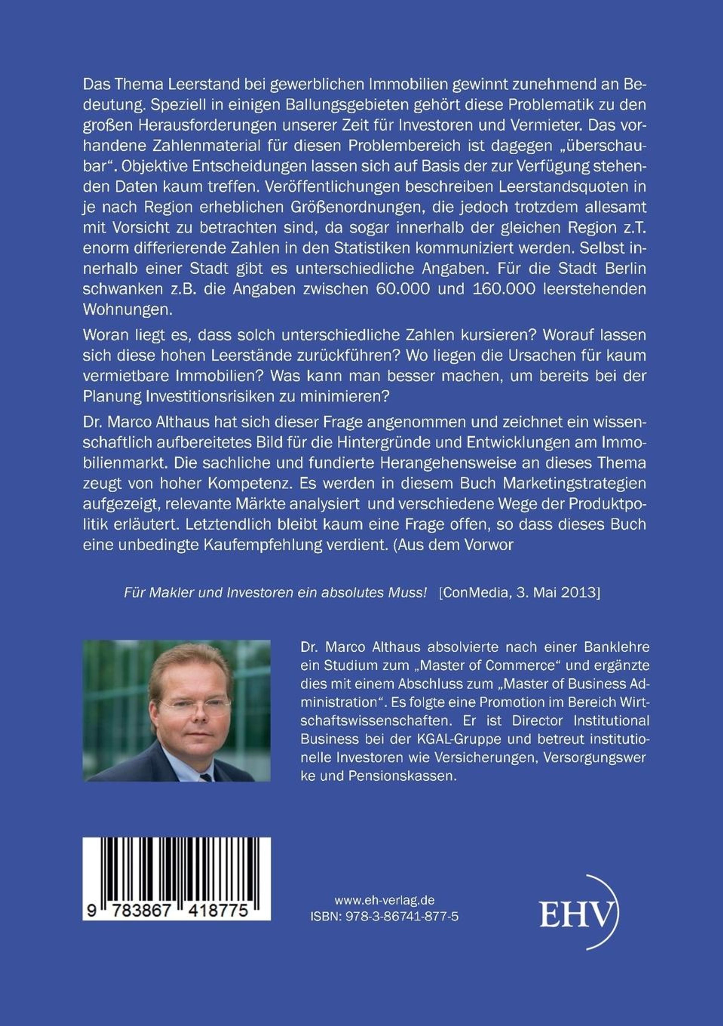 Das Thema Leerstand bei gewerblichen Immobilien gewinnt zunehmend an Bedeutung. Speziell in einigen Ballungsgebieten gehört diese Problematik zu den großen Herausforderungen unserer Zeit für Investoren und Vermieter. Das vorhandene Zahlenmaterial für diesen Problembereich ist dagegen ¿überschaubar¿. Objektive Entscheidungen lassen sich auf Basis der zur Verfügung stehenden Daten kaum treffen. Veröffentlichungen beschreiben Leerstandsquoten in je nach Region erheblichen Größenordnungen, die jedoch trotzdem allesamt mit Vorsicht zu betrachten sind, da sogar innerhalb der gleichen Region z. T. enorme differierende Zahlen in den Statistiken kommuniziert werden. Selbst innerhalb einer Stadt gibt es unterschiedliche Angaben. Für die Stadt Berlin schwanken z. B. die Angaben zwischen 60.000 und 160.000 leerstehenden Wohnungen. Woran liegt es, dass solch unterschiedliche Zahlen kursieren? Worauf lassen sich diese hohen Leerstände zurückführen? Wo liegen die Ursachen für kaum vermietbare Immobilien? Was kann man besser machen, um bereits bei der Planung Investitionsrisiken zu minimieren? Dr. Marco Althaus hat sich dieser Frage angenommen und zeichnet ein wissenschaftlich aufbereitetes Bild für die Hintergründe und Entwicklungen am Immobilienmarkt. Die sachliche und fundierte Herangehensweise an dieses Thema zeugt von hoher Kompetenz. Es werden in diesem Buch Marketingstrategien aufgezeigt, relevante Märkte analysiert und verschiedene Wege der Produktpolitik aufgezeigt. Letztendlich bleibt kaum eine Frage offen, so dass dieses Buch eine unbedingte Kaufempfehlung verdient. (Aus dem Vorwort)