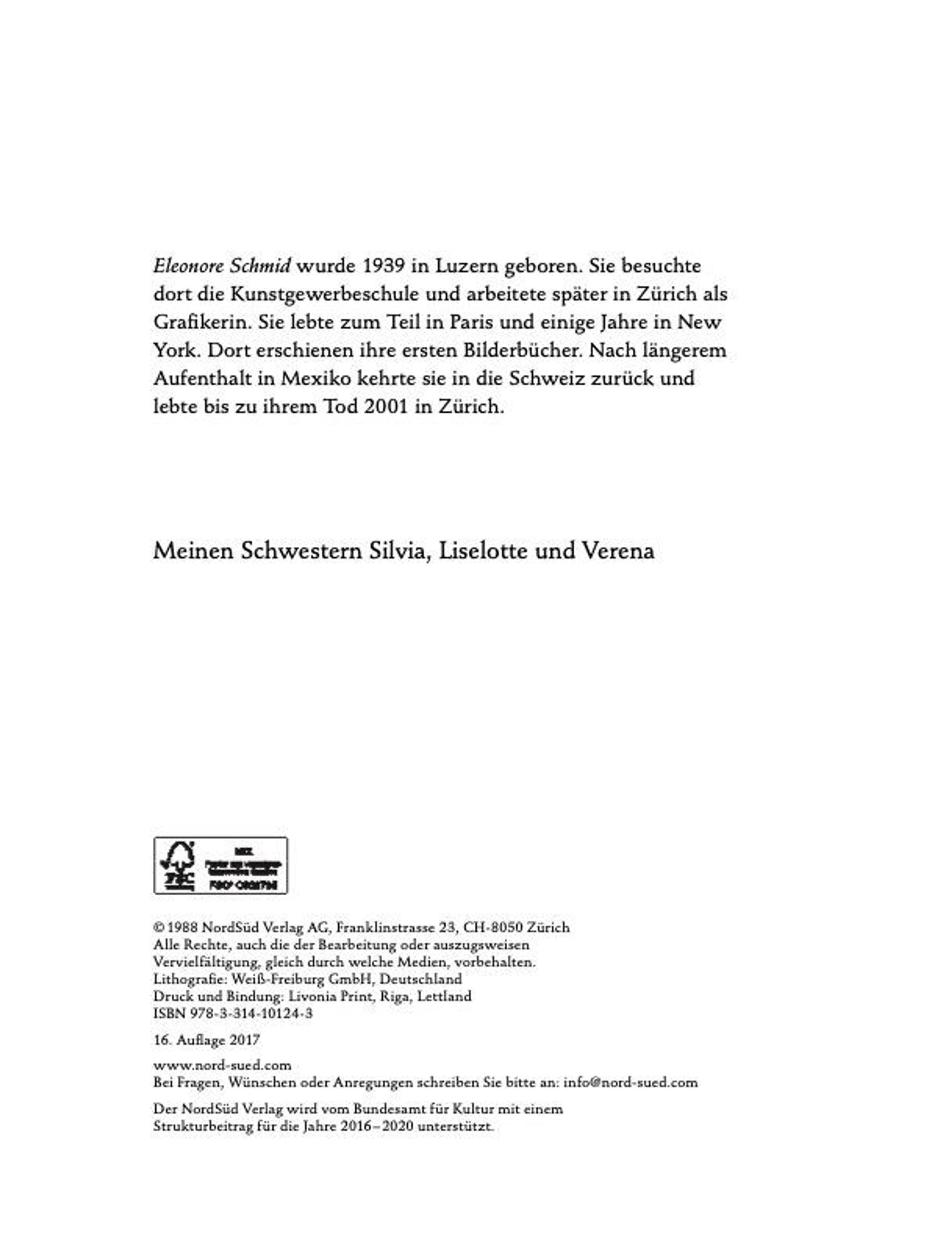 Eleonore Schmid, geboren 1939 in Luzern, besuchte die Kunstgewerbeschule in Luzern und arbeitete während drei Jahren in Zürich als Grafikerin. Zudem gestaltete sie Bücher und illustrierte Kinderzeitschriften, Spiele, kulinarische Karten und Briefmarken. Nach Reisen in Europa zog sie nach Paris und später für drei Jahre nach New York. Dort erschienen die ersten einer ganzen Reihe von Bilderbüchern. Nach längerem Aufenthalt in Mexiko kehrte sie in die Schweiz zurück und lebte bis zu ihrem Tod 2001 in Zürich.Biografie (Eleonore Schmid)