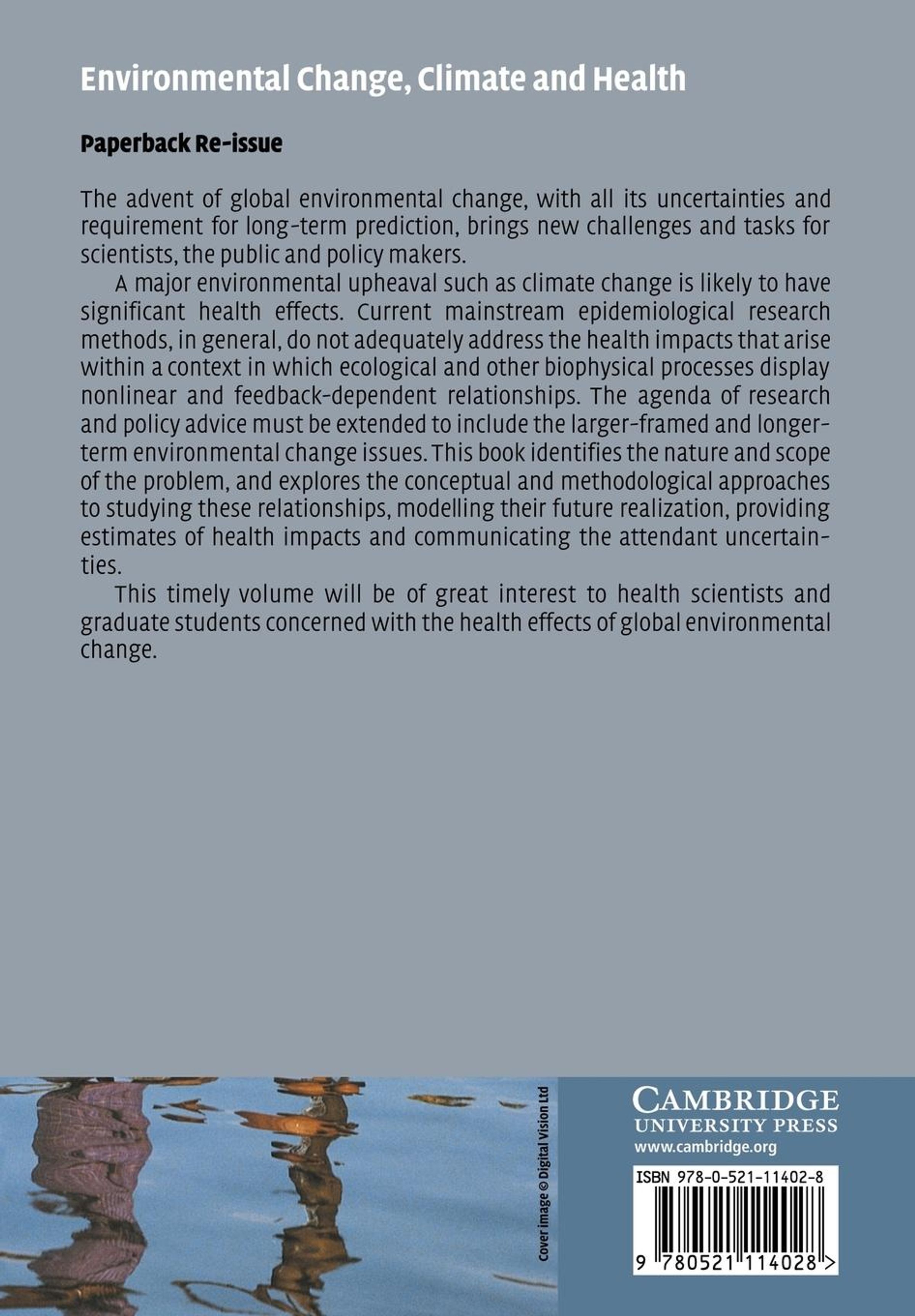 The advent of global environmental change, with all its uncertainties and requirement for long-term prediction, brings new challenges and tasks for scientists, the public and policy makers. A major environmental upheaval such as climate change is likely to have significant health effects. Current mainstream epidemiological research methods do not always adequately address the health impacts that arise within a context in which the ecological and other biophysical processes display non-linear and feedback-dependent relationships. The agenda of research and policy advice must be extended to include the larger-framed environmental change issues. This book identifies the nature and scope of the problem, and explores the conceptual and methodological approaches to studying these relationships, modelling their future realisation, providing estimates of health impacts, and communicating the attendant uncertainties. This timely volume will be of great interest to health scientists and graduate students with an interest in the effects of global environmental change.