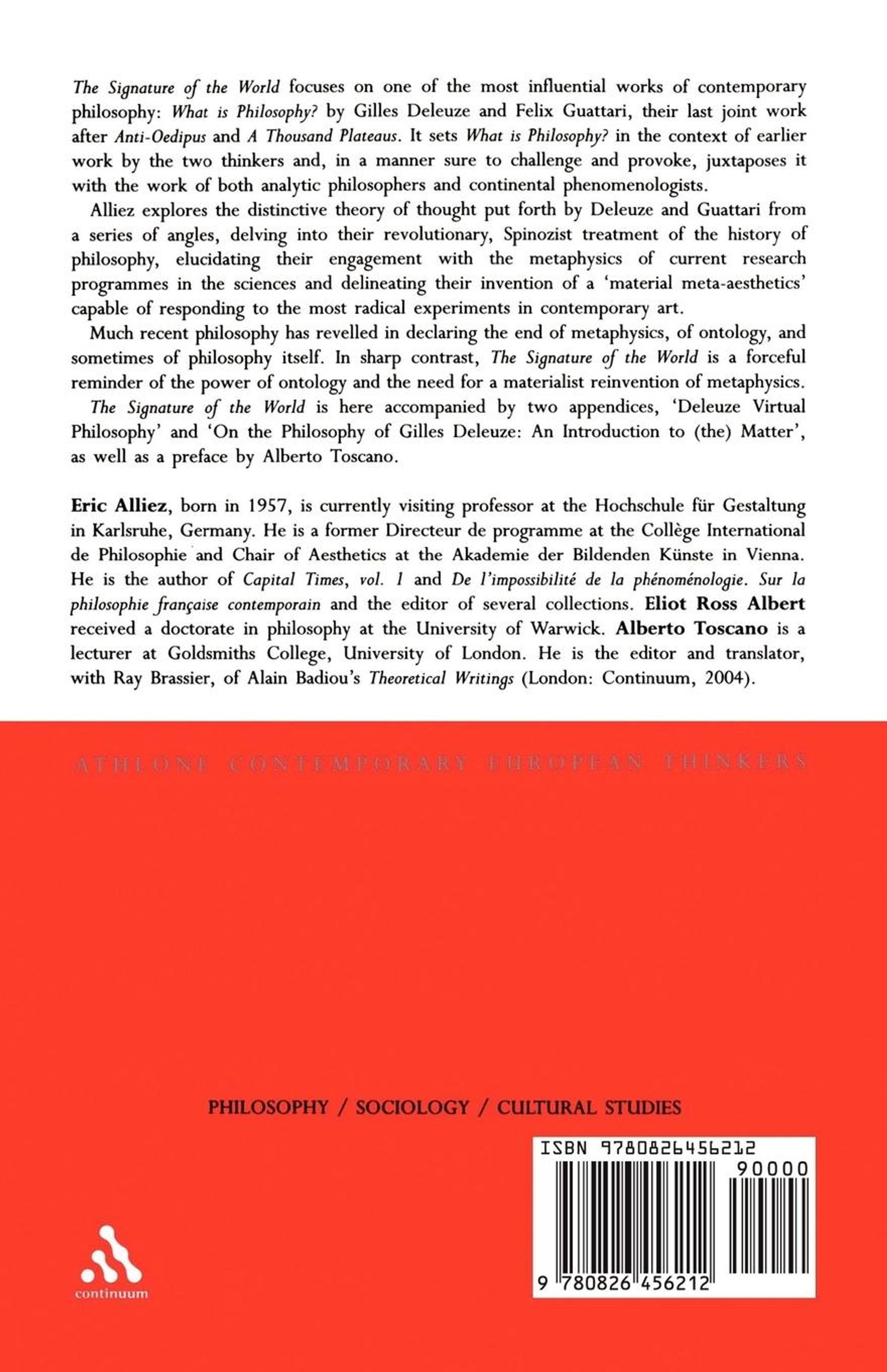 The Signature of the World focuses on one of the most influential works of contemporary philosophy: What is Philosophy? by Gilles Deleuze and Felix Guattari, their last joint work after Anti-Oedipus and A Thousand Plateaus. It sets What is Philosophy? in the context of earlier work by the two thinkers and, in a manner sure to challenge and provoke, juxtaposes it to the work of both analytic philosophers and continental phenomenologists.