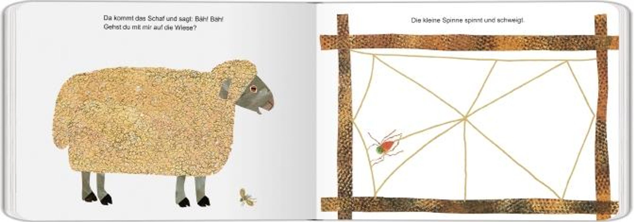 Eric Carles beliebtes Tastbilderbuch! Eines Morgens treibt der Wind eine kleine Spinne an ihrem silberhellen Faden über das Feld. Sie landet auf einem Zaunpfahl eines Bauernhofs und beginnt, dort ihr Netz zu spinnen. Ein Pferd kommt an den Zaun und wiehert: 'Jiihiia! Jiihiia! Willst du reiten?' Doch die kleine Spinne spinnt und schweigt. Nach und nach kommen auch die anderen Tiere vom Bauernhof vorbei, aber die kleine Spinne lässt sich nicht beirren. So wächst und wächst ihr Netz, bis es fertig ist und sie - schwupp! - die freche Fliege fängt. Eric Carles farbenfroh illustrierte Geschichte über Beharrlichkeit und Ausdauer der kleinen Spinne regt alle Sinne an: die Tierstimmen lassen sich beim Vorlesen wunderbar nachahmen, die Tiere werden mit typischen Bewegungen vorgestellt und Spinnfaden, Spinne und Fliege sind ertast- und fühlbar auf die Seiten aufgedruckt. Ein wunderbares Kinderbuch zum Sehen, Hören und Fühlen!
