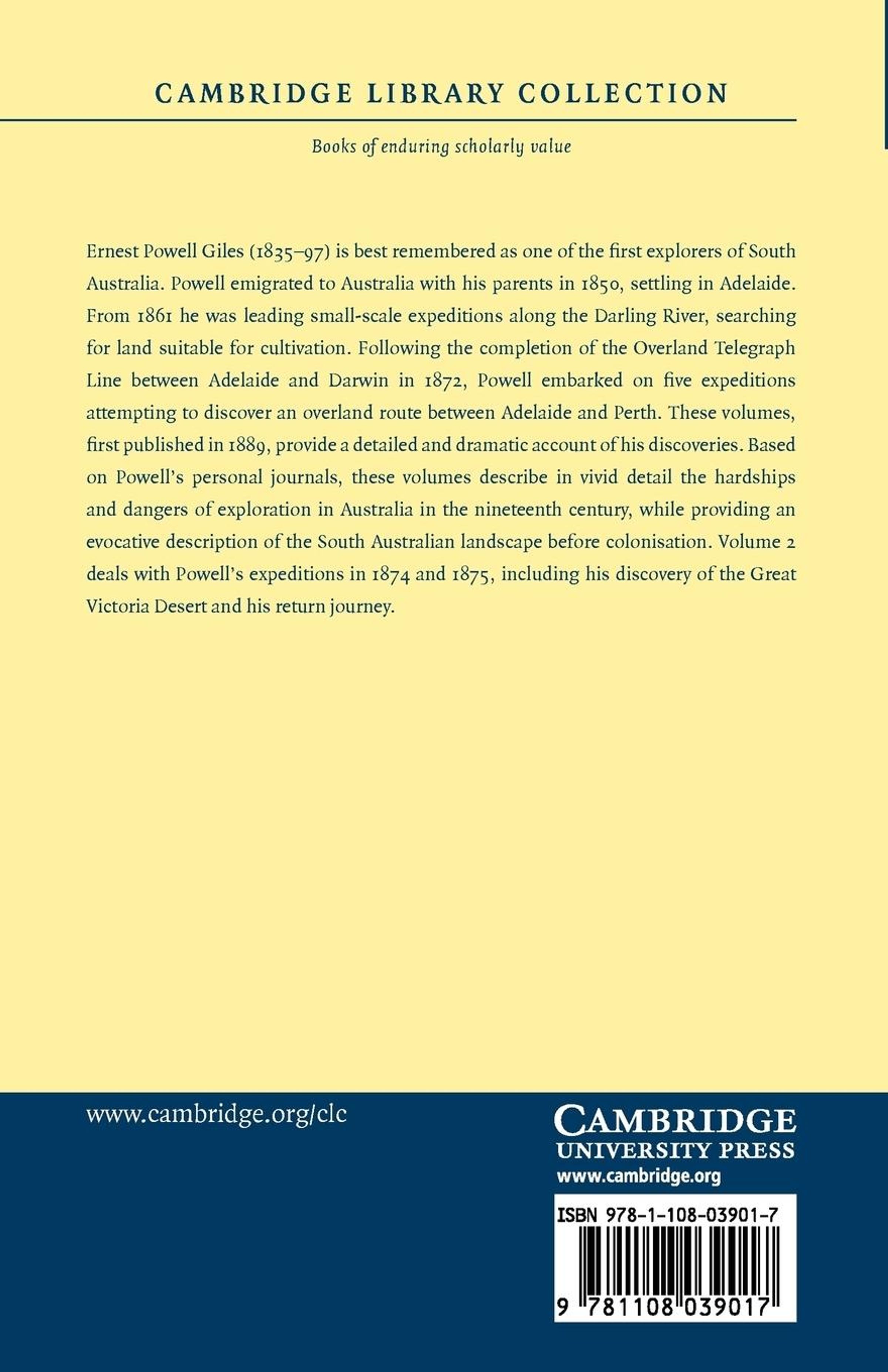 Ernest Powell Giles (1835-97) is best remembered as one of the first explorers of South Australia. Powell emigrated to Australia with his parents in 1850, settling in Adelaide. From 1861 he was leading small-scale expeditions along the Darling River, searching for land suitable for cultivation. Following the completion of the Overland Telegraph Line between Adelaide and Darwin in 1872, Powell embarked on five expeditions attempting to discover an overland route between Adelaide and Perth. These volumes, first published in 1889, provide a detailed and dramatic account of his discoveries. Based on Powell's personal journals, these volumes describe in vivid detail the hardships and dangers of exploration in Australia in the nineteenth century, while providing an evocative description of the South Australian landscape before colonisation. Volume 2 deals with Powell's expeditions in 1874 and 1875, including his discovery of the Great Victoria Desert and his return journey.