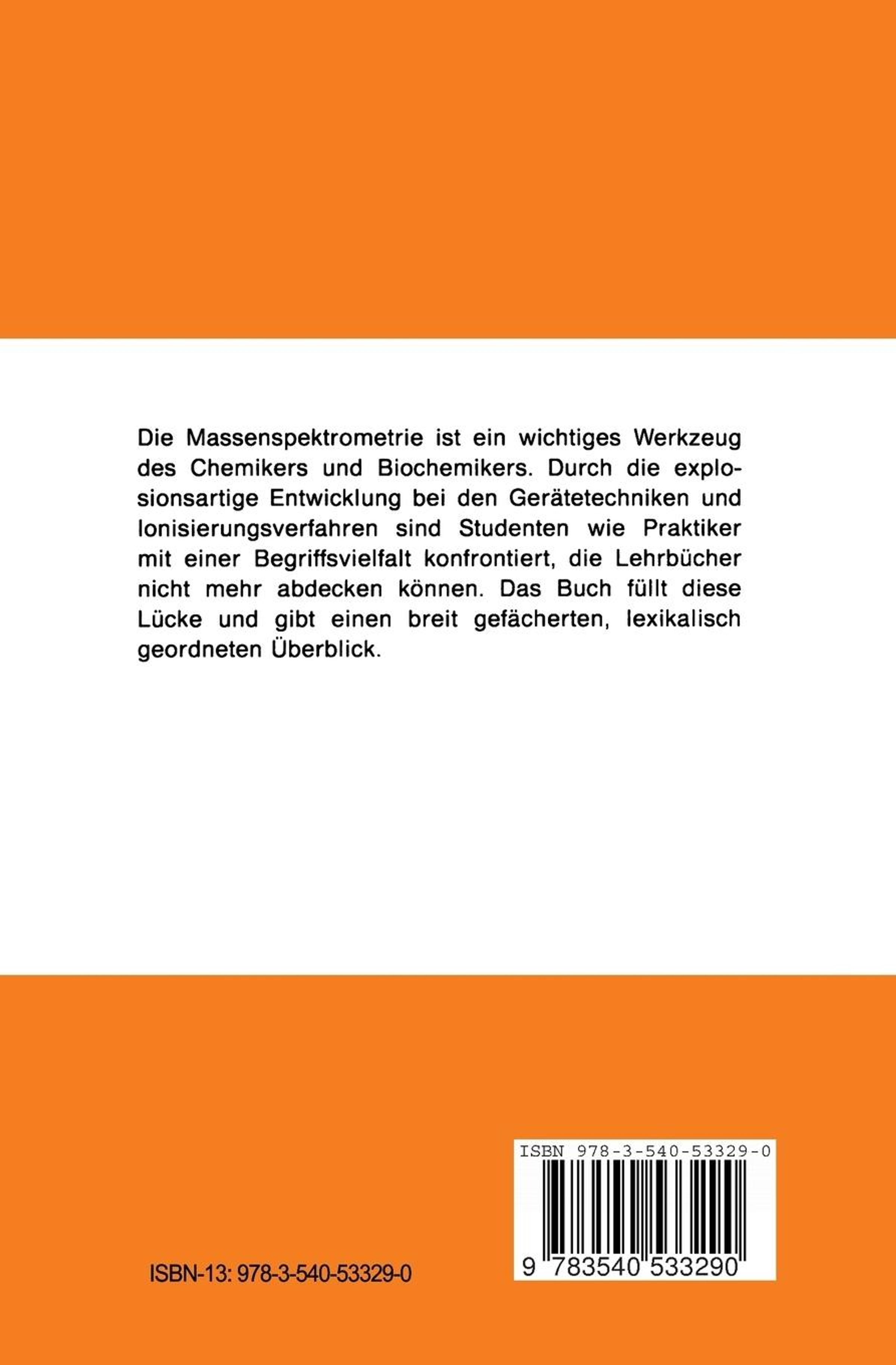 Die Massenspektrometrie ist ein wichtiges Werkzeug des Chemikers und Biochemikers. Durch die explosionsartige Entwicklung bei den Gerätetechniken und Ionisierungsverfahren sind Studenten wie Praktiker mit einer Be- griffsvielfalt konfrontiert, die Lehrbücher nicht mehr abdecken können. Das Buch füllt diese Lücke und gibt einen breit gefächerten, lexikalisch geordneten Überblick.