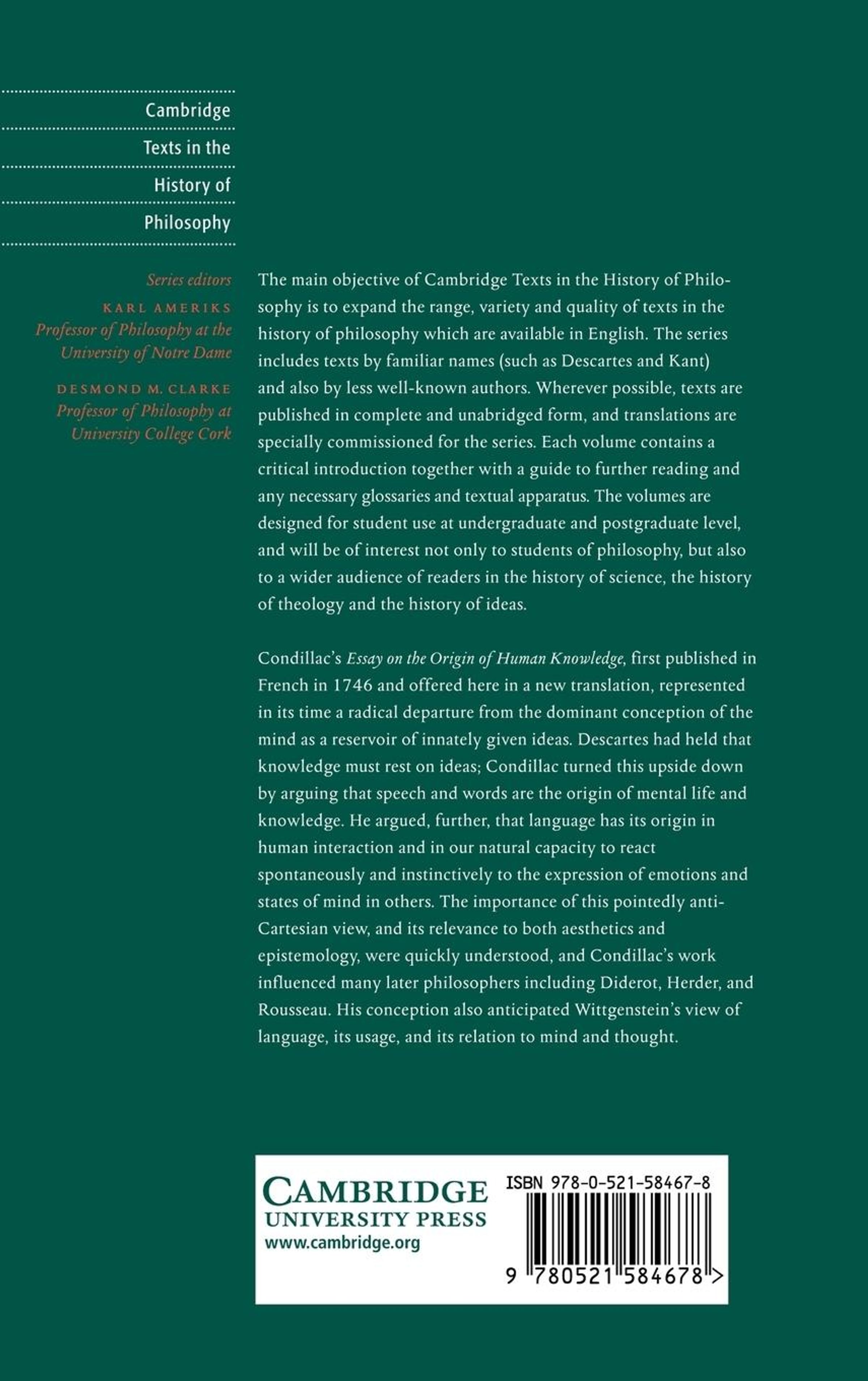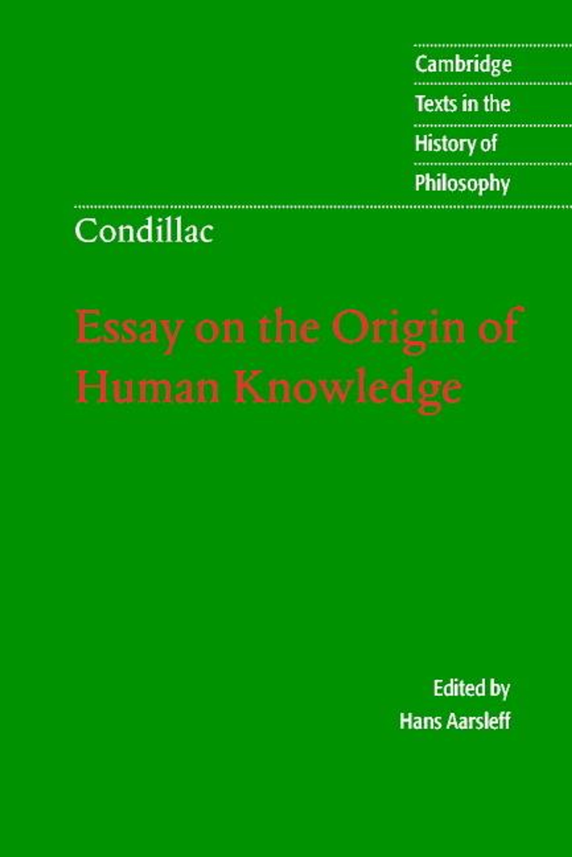 Condillac's Essay on the Origin of Human Knowledge, first published in French in 1746 and offered here in a new translation, represented in its time a radical departure from the dominant conception of the mind as a reservoir of innately given ideas. Descartes had held that knowledge must rest on ideas; Condillac turned this upside down by arguing that speech and words are the origin of mental life and knowledge. He argued, further, that language has its origin in human interaction and in our natural capacity to react spontaneously and instinctively to the expression of emotions and states of mind in others. The importance of this pointedly anti-Cartesian view, and its relevance to both aesthetics and epistemology, were quickly understood, and Condillac's work influenced many later philosophers including Herder, Rousseau, and Adam Smith. His conception also anticipated Wittgenstein's view of language, its usage, and its relation to mind and thought.