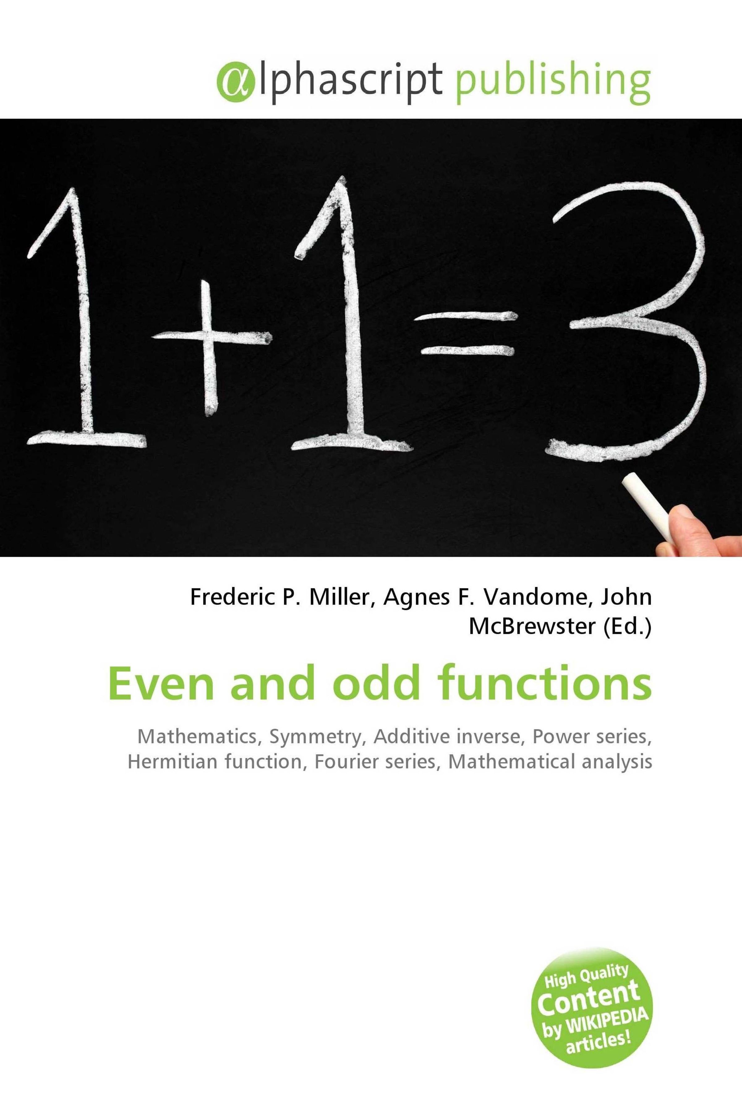 In mathematics, even functions and odd functions are functions which satisfy particular symmetry relations with respect to taking additive inverses. They are important in many areas of mathematical analysis, especially the theory of power series and Fourier series. They are named for the parity of the powers of the power functions which satisfy each condition: the function f (x ) = xn is an even function if n is an even integer and it is an odd function if n is an odd integer.
