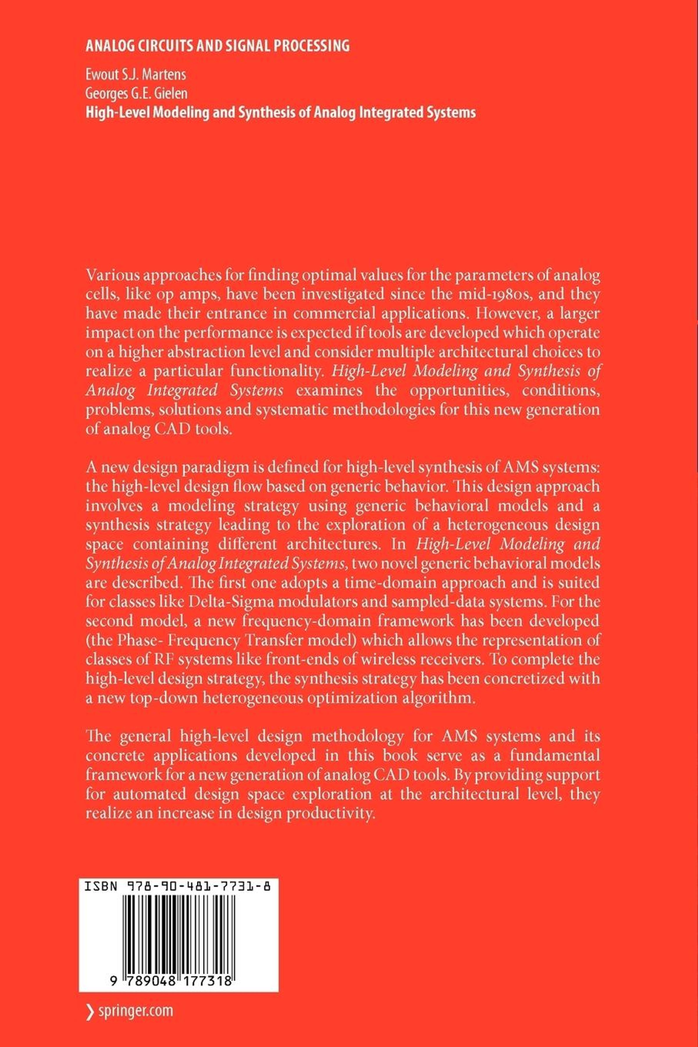 As the miniaturization of semiconductor technology continues, electronic s- tems on chips o?er a more extensive and more complex functionality with better performance, higher frequencies and less power consumption. Whereas digital designers can take full advantage of the availability of design auto- tiontoolstobuildhugesystems, thelackofsupportbycomputerprogramsfor di?erent abstraction levels makes analog design a time-consuming handcraft which limits the possibilities to implement large systems. Various approaches for?ndingoptimalvaluesfortheparametersofanalogcells, likeopamps, have been investigated since the mid-1980s, and they have made their entrance in commercial applications. However, a larger impact on the performance is - pected if tools are developed which operate on a higher abstraction level and consider multiple architectural choices to realize a particular functionality. In this book, the opportunities, conditions, problems, solutions and systematic methodologies for this new generation of analog CAD tools are examined. Theoutlineofthisbookisasfollows. Inthe?rstpart, thecharacteristicsof the analog design process are systematically analyzed and several approaches for automated analog synthesis are summarized. Comparison of their prop- ties with the requirements for high-level synthesis of analog and mixed-signal systems results in a new design paradigm: the high-level design ?ow based on generic behavior. This design approach involves a modeling strategy using generic behavioral models and a synthesis strategy leading to the exploration of a heterogeneous design space containing di?erent architectures. The modeling strategy is further elaborated in Part II.