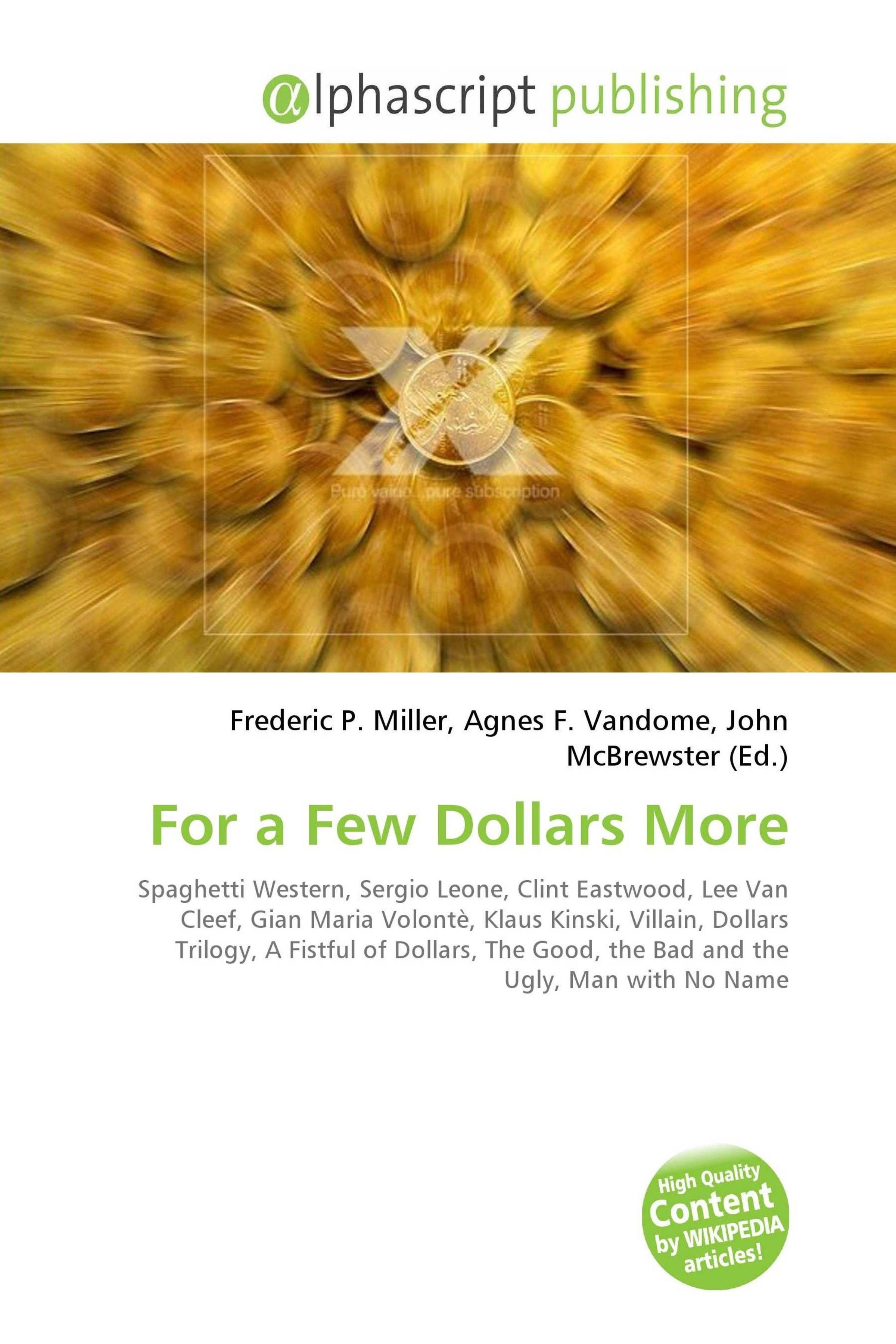 Please note that the content of this book primarily consists of articles available from Wikipedia or other free sources online. For a Few Dollars More (Italian: Per qualche dollaro in più) is a 1965 Italian spaghetti western film directed by Sergio Leone and starring Clint Eastwood, Lee Van Cleef and Gian Maria Volontè. German actor Klaus Kinski also plays a supporting role as a secondary villain. The film was released in the United States in 1967 and is the second part of what is commonly known as the "Man with No Name" trilogy.